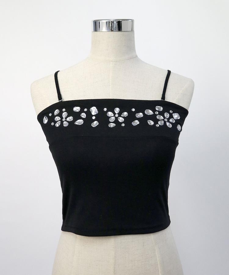 ◆Design胸元部分にビジューがあしらわれたキャミソールは、シンプルながらも華やかさを引き立てるアイテムです。キラキラとした輝きが上品。クロップド丈で肌魅せアイテム。調整可能なストラップで、フィット感を自由に調整可能。