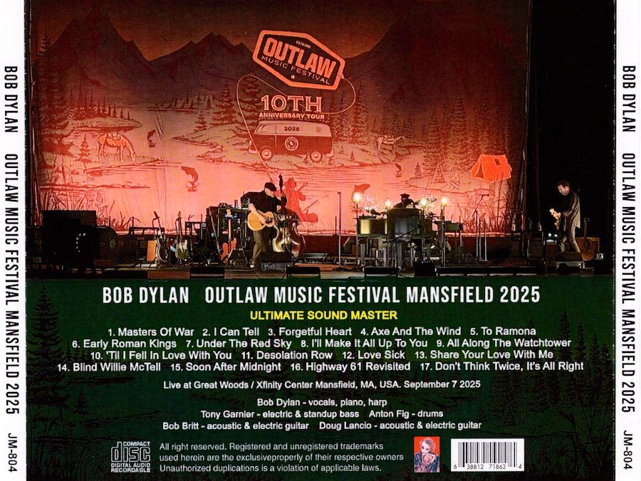2025年に10周年を迎えたOUTLAW MUSIC FESTIVALの最終日の9月7日のマサチューセッツ州マンスフィールド公演をオーディエンス録音最高峰のアルティメイト・サウンドで77分に渡り完全収録。8月8日のバッファロー公演からセットインした「戦争の親玉」。現在の世界情勢を的確に捉えた歌であり最終日のアレンジが非常に素晴しい。「Forgetful Heart」「Under The Red Sky」「All Along The Watchtower」「Desolation Row」「 Love Sick」「 Don't Think Twice, It's All Right」などの新旧の名曲とカヴァー・ソングを織り交ぜた心温まるスペシャルなライブ。フードを被り両手を上げたポーズが話題になった最終日の情熱的な感動のライブを極上サウンドで存分にお楽しみ頂けます。