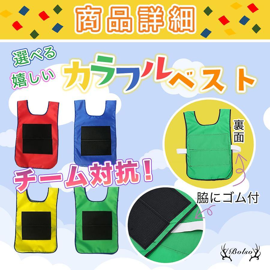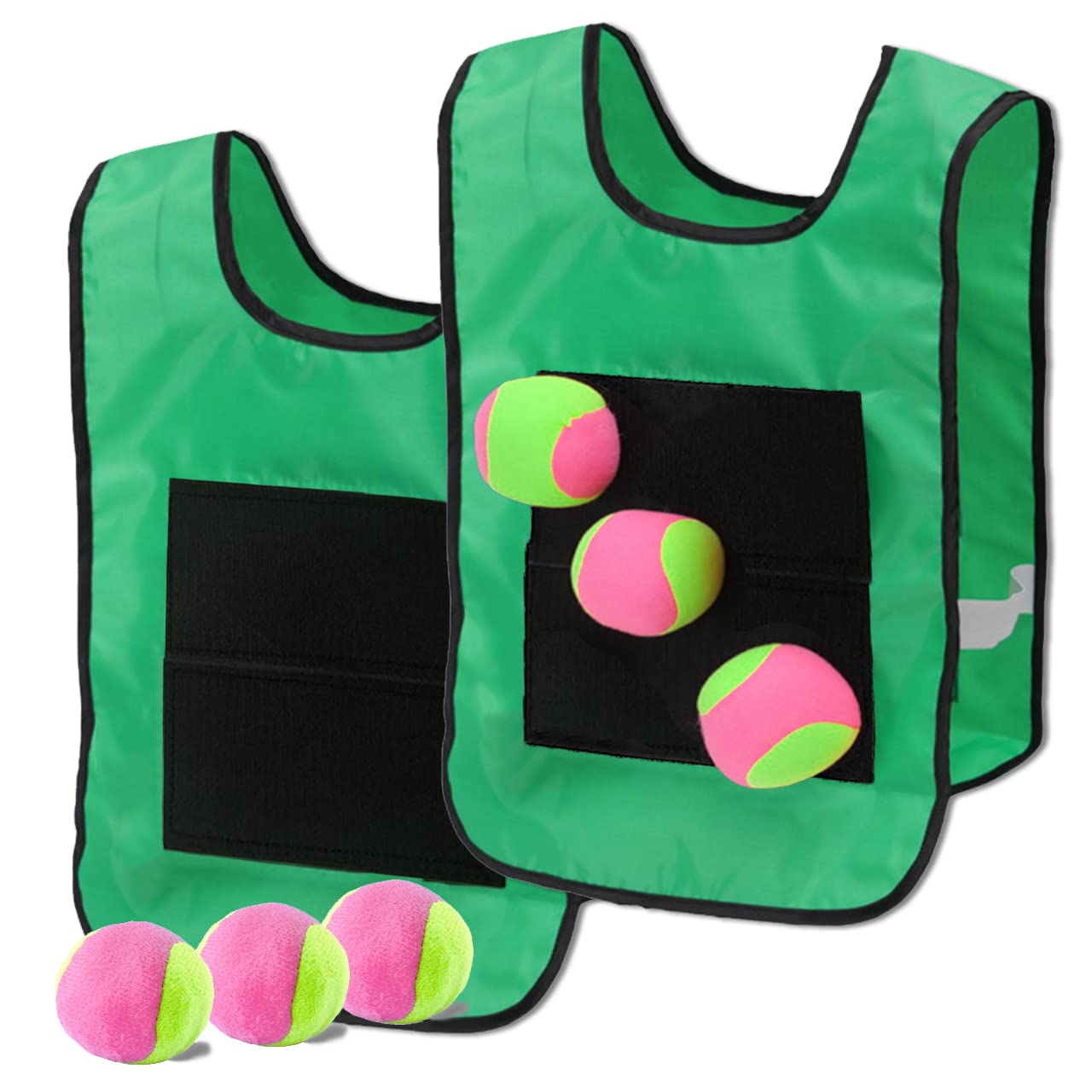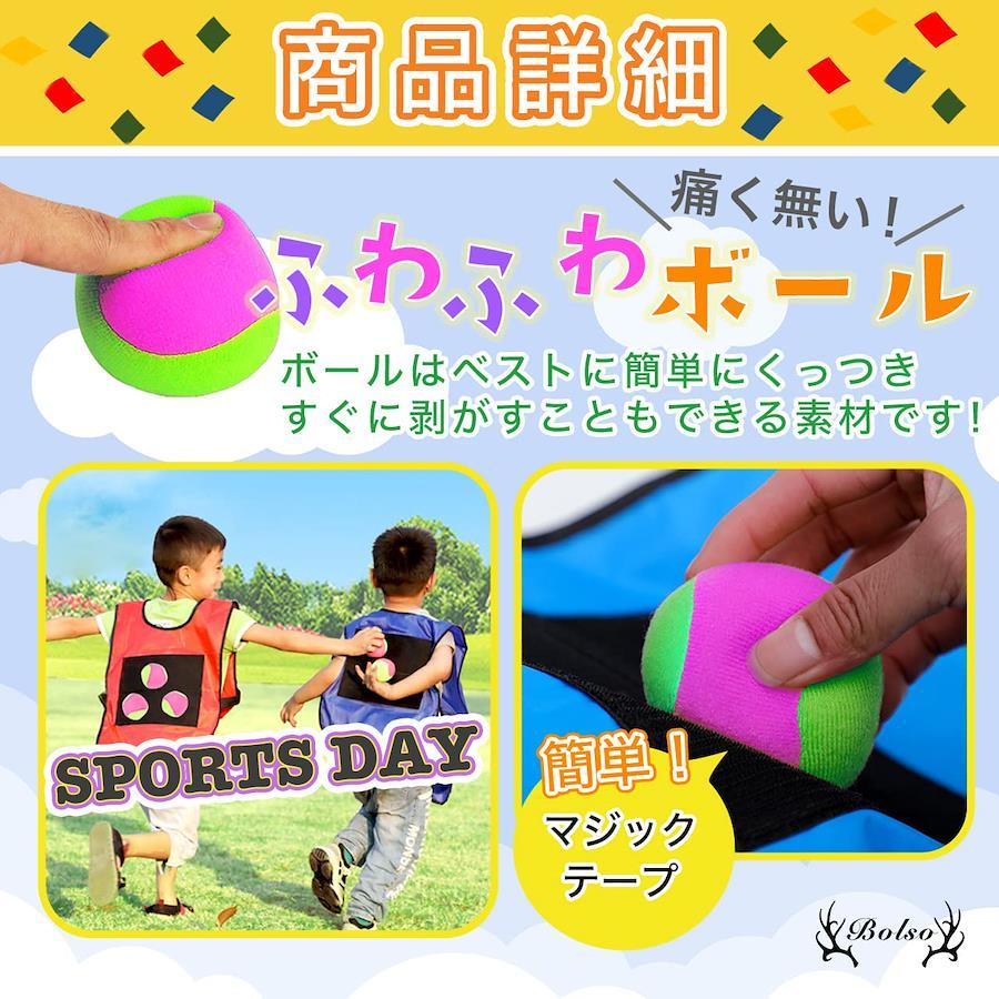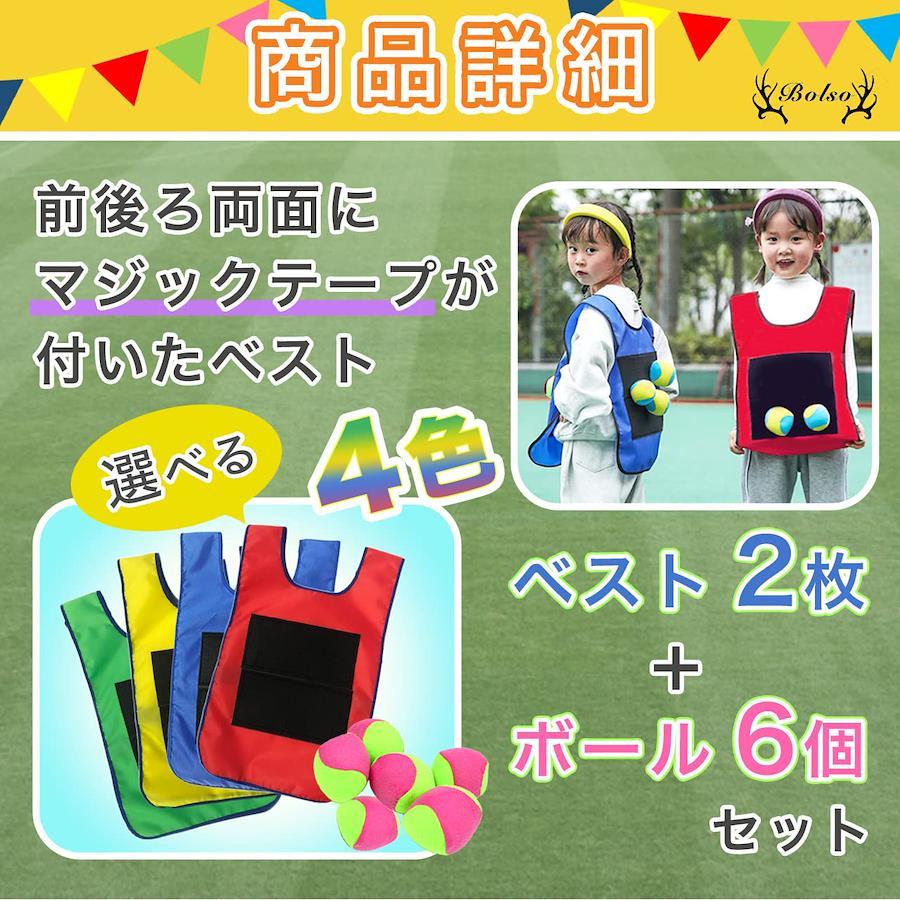 前後ろ両面にマジックテープが付いたベスト2枚とボール6個のセット!ボールはベストに簡単にくっつき、すぐに剥がすこともできる素材でできているので、お子様のボール当て遊びにぴったり!ボールは当たっても痛くないふわふわの柔らかい素材でできているため安心!思いっきり投げてストレス解消にもなります!外遊びや公園遊びで大活躍なこと間違いなし!カラーバリエーションはレッド、ブルー、イエロー、グリーンの嬉しい4色展開!おしゃれでカラフルな色合いは子供たちにも喜ばれることでしょう。また、複数のカラーでチーム分けして遊ぶこともできます。【遊び方の例】例1:あらかじめ逃げる範囲を決めて、お互いにボールをぶつけ合う。時間内に多くのボールをぶつけた方の勝ち!例2:大きめの円を用意し、円の中にボールから逃げる人、外にボールを投げる人で分かれる。時間内に当てられたボールが少ない方が勝ち!その他にもアイデア次第で沢山の遊び方ができます!セット内容:ベスト2枚、ボール6個 カラーバリエーション:レッド、ブルー、イエロー、グリーン ベストサイズ:縦48cm横29cm 是非こちらの的当てダーツボールベスト2枚セットで屋外公園遊びを楽しんで下さい!【免責事項】メーカーによる商品リニューアルに伴いパッケージ(内容量も含む)変更が行われた場合、新パッケージでお届け致します事ご了承願います。