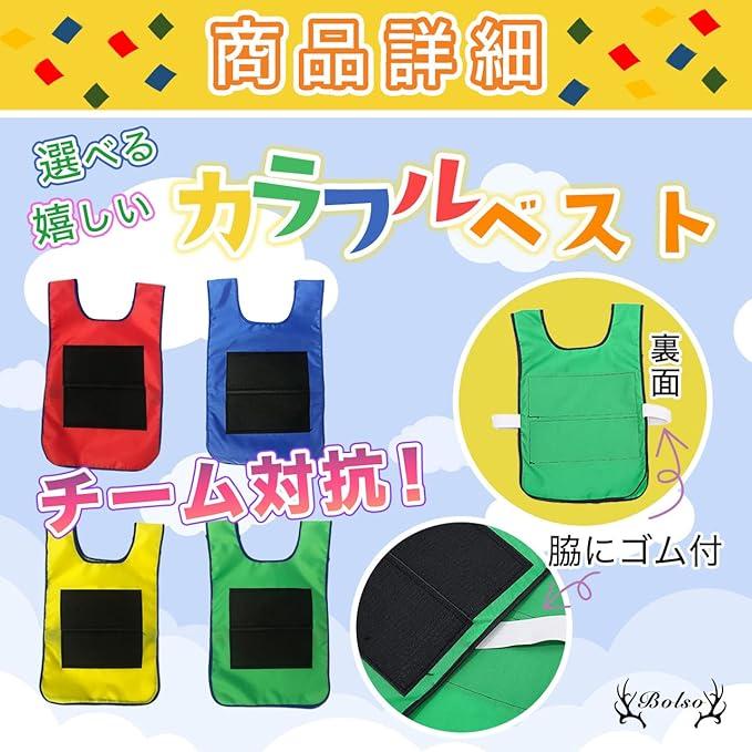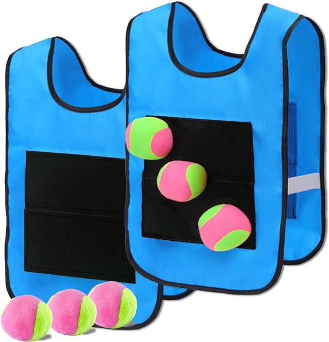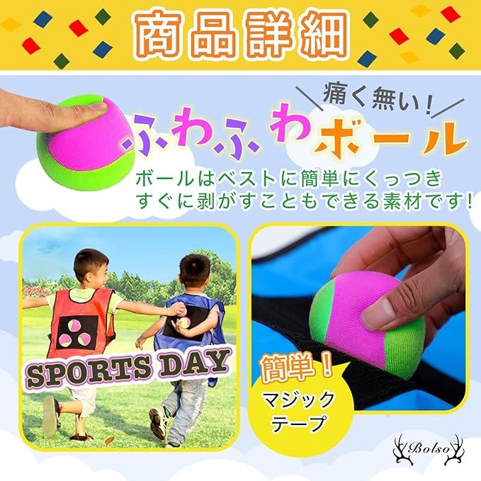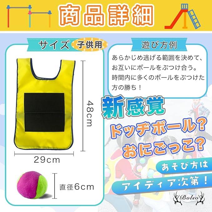 ■商品説明前後ろ両面にマジックテープが付いたベスト2枚とボール6個のセット!ボールはベストに簡単にくっつき、すぐに剥がすこともできる素材でできているので、お子様のボール当て遊びにぴったり! ボールは当たっても痛くないふわふわの柔らかい素材でできているため安心!思いっきり投げてストレス解消にもなります!外遊びや公園遊びで大活躍なこと間違いなし! カラーバリエーションはレッド、ブルー、イエロー、グリーンの嬉しい4色展開!おしゃれでカラフルな色合いは子供たちにも喜ばれることでしょう。また、複数のカラーでチーム分けして遊ぶこともできます。 【遊び方の例】例1:あらかじめ逃げる範囲を決めて、お互いにボールをぶつけ合う。時間内に多くのボールをぶつけた方の勝ち!例2:大きめの円を用意し、円の中にボールから逃げる人、外にボールを投げる人で分かれる。時間内に当てられたボールが少ない方が勝ち!その他にもアイデア次第で沢山の遊び方ができます! セット内容:ベスト2枚、ボール6個 カラーバリエーション:レッド、ブルー、イエロー、グリーン ベストサイズ:縦48cm横29cm 是非こちらの的当てダーツボールベスト2枚セットで屋外公園遊びを楽しんで下さい!?もっと見る