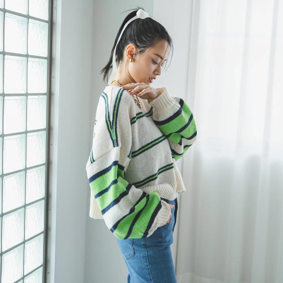 ピッチの違うボーダーとアクセントになるカラー配色がpointのボーダーニットトップス