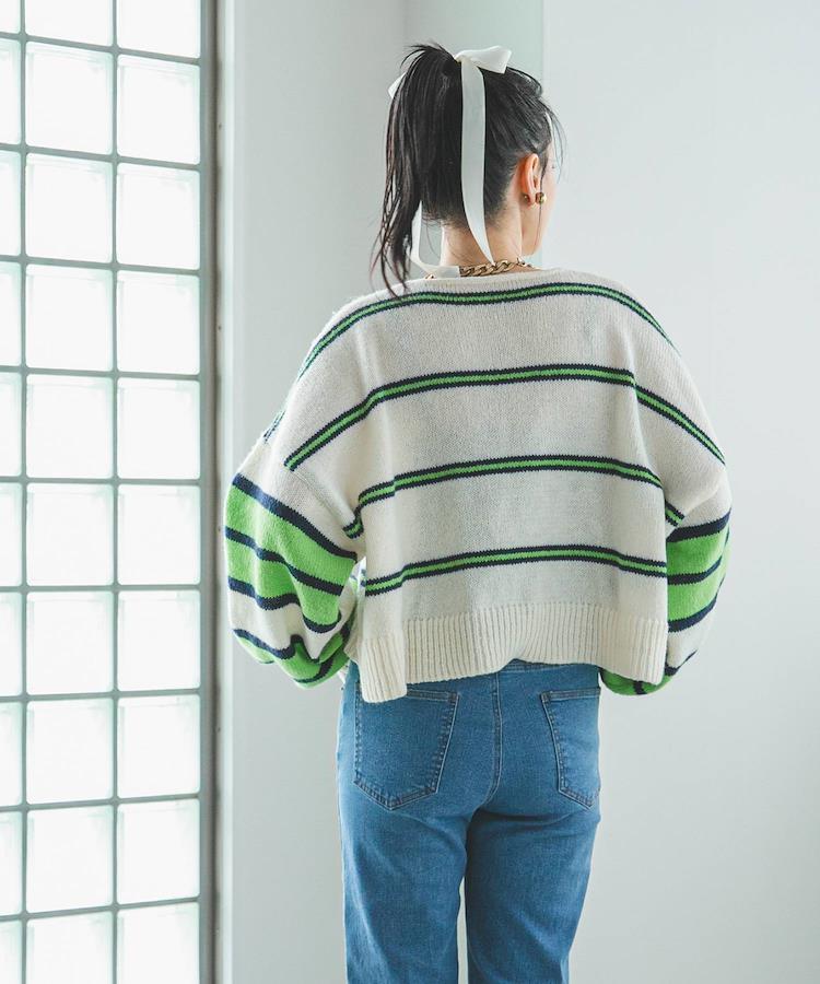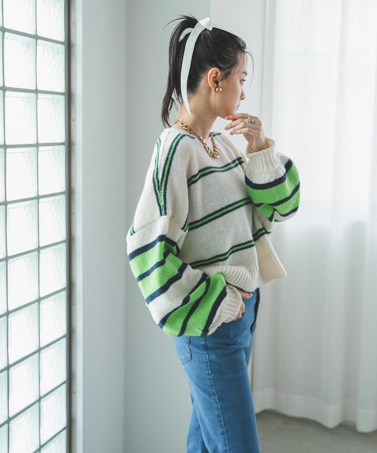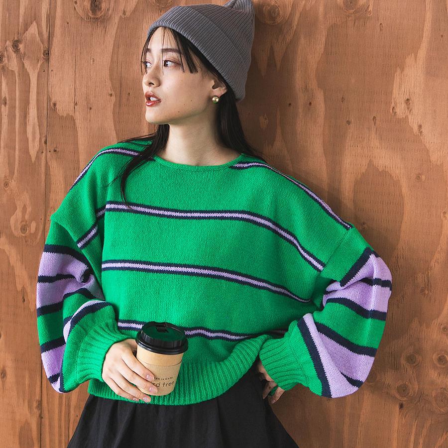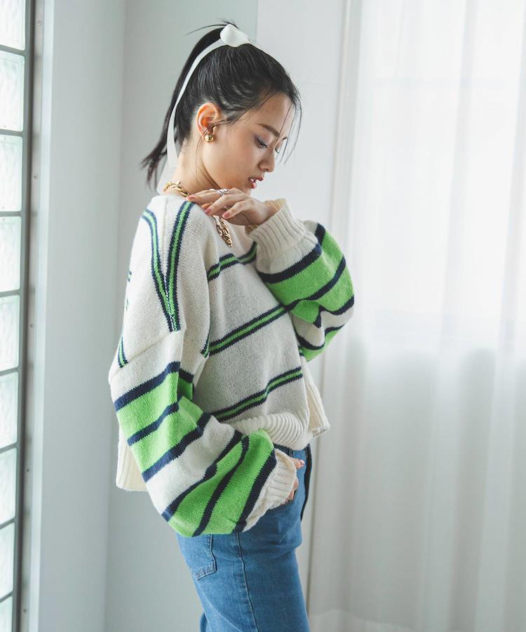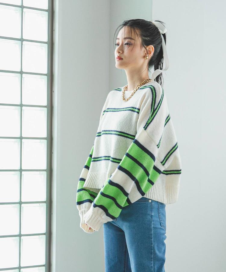 ピッチの違うボーダーとアクセントになるカラー配色がpointのボーダーニットトップス