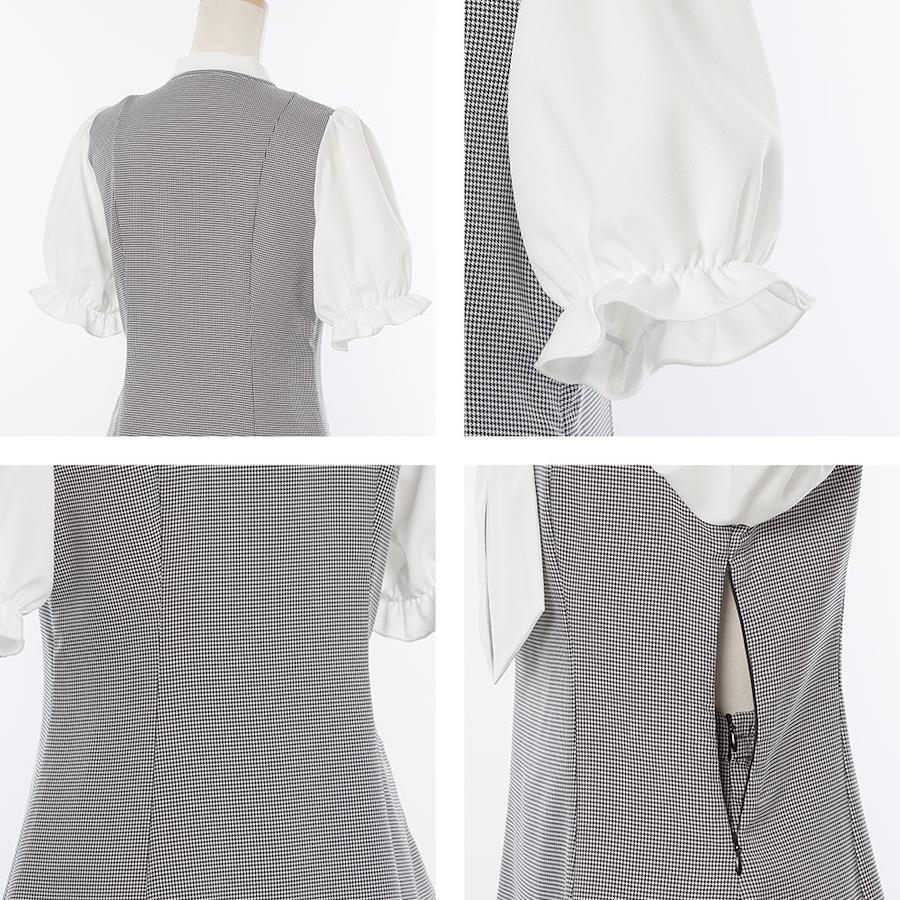 トップスは、襟元のボタンと左脇のファスナーを開けて、被りで簡単に着用いただけます。ボウタイリボンは、ご自身で結んでいただく仕様です。