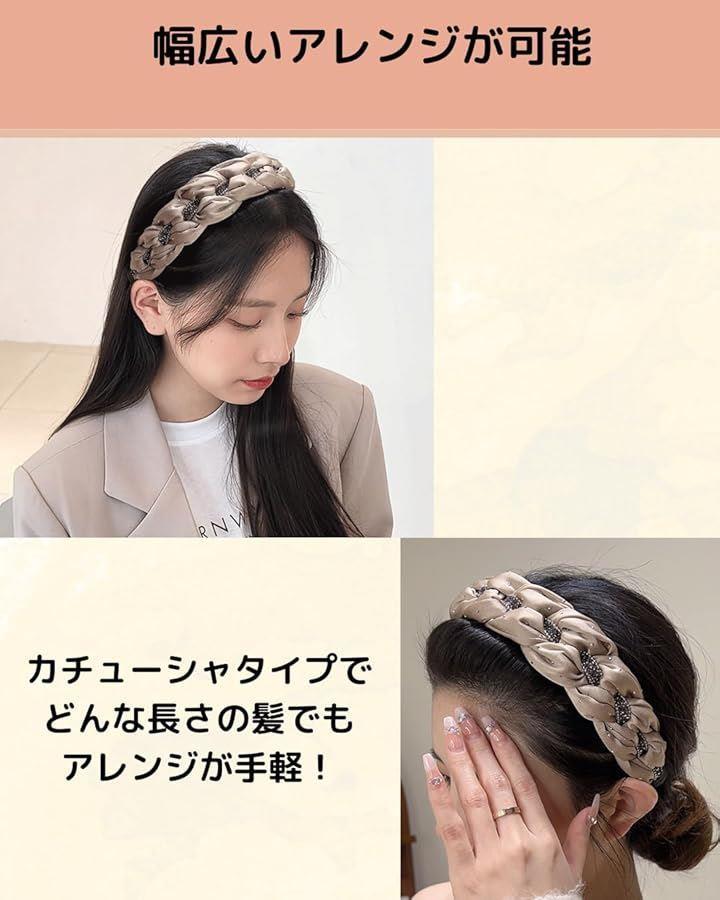 ・「編み込みサテンで高見え」 しっとり光沢のサテンを3本編み。