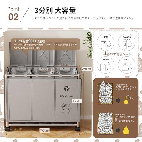 【3分別*30L 90L大容量】本体サイズ:長70*幅29*高59cm。3分別で缶・びん・ペットボトル、プラスチック製容器包装、古紙など各種ゴミを効率的に分類できます。高い空間効率を実現し、見た目がすっきりとしたデザインでデッドスペースを最小限に抑えます 【目隠しゴミ箱 おしゃれ】ゴミ袋を隠すカバーが付いており、リビングルーム・キッチン・オフィスなど、様々な部屋に適しています。また、カバーにマジックテープ付いておりので、ゴミ箱を前開きして容量を確認できます 【キャスター付き 移動楽々】キャスターが装備されているため、ゴミ箱の移動が非常に楽になります。掃除する時やゴミ箱を移動したい場合も、日常の清掃がもっと簡単になります 【耐久性&衛生的な素材】フレームはステンレス鋼製で耐久性が高く、カバーは不織布で取り外し可能なため清掃が簡単で衛生的です。夏場でも臭い漏れを抑えることができるプラスチック製のフタも、機能性とデザインの両方で優れています 【ゴミ袋の取り替えが簡単】固定クリップゴミ袋を通す押すだけ設置でき、取り替え作業が非常に簡単になります。底板が付いているため、ゴミ袋が底までしっかりと収納できます