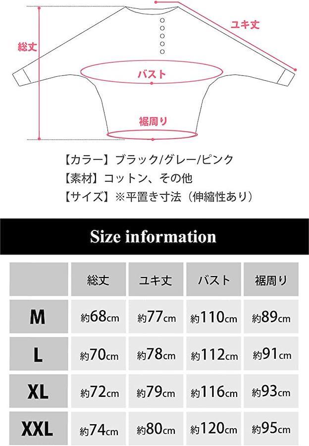 ・「カラー」ブラック/グレー/ピンク「素材」コットン、その他 「サイズ」「M」:総丈 約68cm/ユキ丈 約77cm/バスト 約110cm/裾周り 約89cm 「L」:総丈 約70cm/ユキ丈 約78cm/バスト 約112cm/裾周り 約91cm 「XL」:総丈 約72cm/ユキ丈 約79cm/バスト 約116cm/裾周り 約93cm 「XXL」:総丈 約74cm/ユキ丈 約80cm/バスト 約120cm/裾周り 約95cm