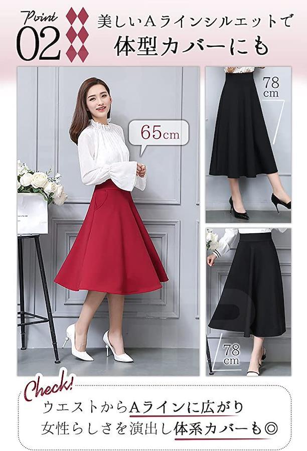 ・ウエストからAラインに広がるフレアなシルエットが、美しい女性らしさを演出し体系カバーにも一役買います・程よい伸縮性のある素材を使用し、ウエストゴム仕様ではき心地の良さも抜群です。