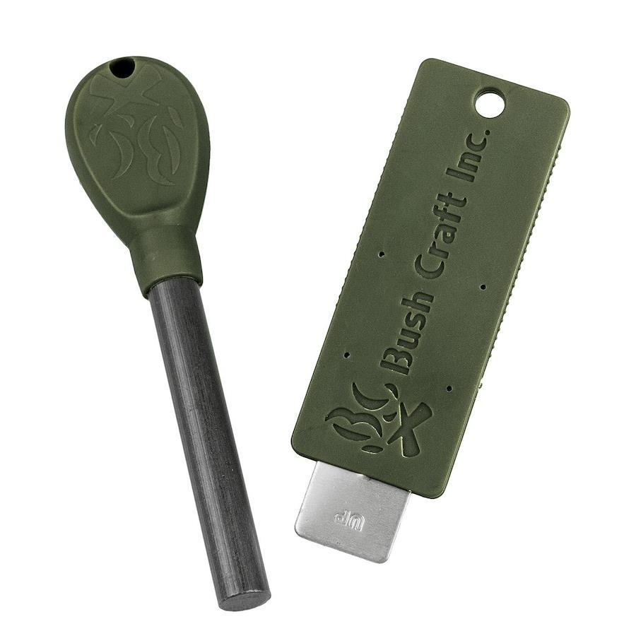 ブッシュクラフトの必需品として発売以来、多くのユーザーに使用されているBush Craft Inc.のファイヤースチール (メタルマッチ )。そのファイヤースチールストライカーのスリーブ位置が改良され、より使いやすくなりました。最上級・最大級 ( ブッシュクラフト社製品シリーズにおいて ) の火花を発生させるメタルマッチ。火花の温度は3000℃に達し、あらゆる火種にたやすく着火します。焚き火はもちろん、アウトドア用ガスストーブ等への着火も容易です。水に濡れた場合でも水気を拭けば着火可能です。着火しにくい火種の場合は火花が出ないようにロッドをゆっくりと削り、ダストを溜めてから火花で着火するとダストが一気に発火し着火力の最大化が可能です。■サイズ:ファイヤースチール/約108×27×20mmロッド長/約60mm直径/9.5mmストライカー/約90×30×20mm※製品によって仕上りサイズに多少の誤差がありますのでご了承下さい。■収納サイズ:約110×30×23mm■重量:ファイヤースチール/55gストライカー/19g■素材:ファイヤースチール/樹脂、フェロセリウムストライカー/樹脂、アルミ■原産国:中国カラー:オリーブドラブ