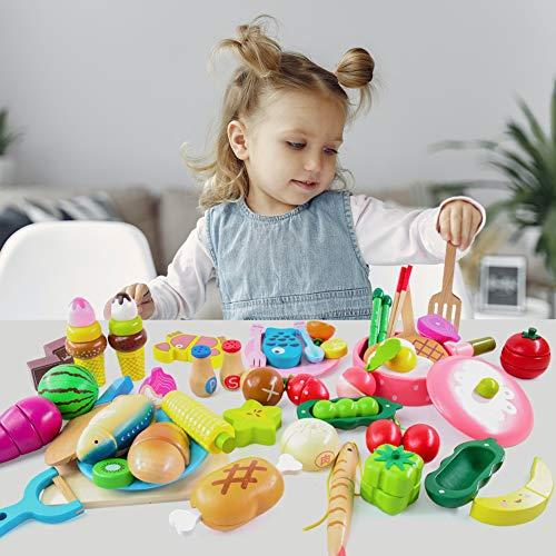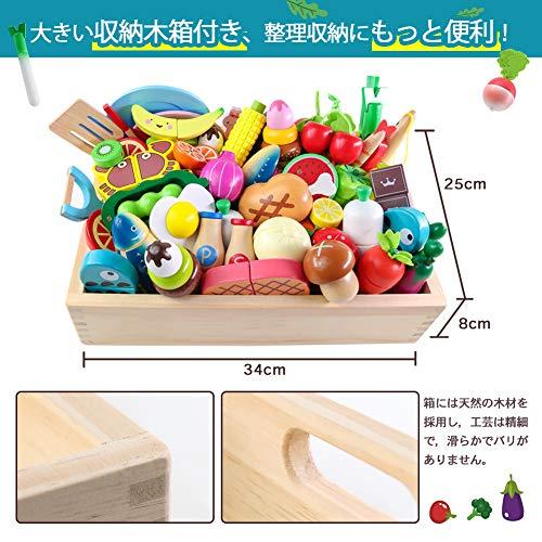 ??【商品情報】適用年齢:6歳以上 サイズ:37cm*27cm*13cm 木箱サイズ:34cm*25cm*8cm 大きい収納木箱付き、整理収納にもっと便利!箱には天然の木材を採用し,工芸は精細で,滑らかでバリがありません。?? ??【食品衛生法検査済】本製品は『日本食品安全衛生法』の検査に合格しました。化学測定でも、物理測定でも日本の法規に則っています。子供の安全は一番のことです。天然木を採用しており硬くて丈夫!どのパーツも角をまぁくる加工をしています。お子さまがケガをしないよう安全に、また小さな手にも優しくフィットするように。木の手触りの良さにおもちゃを握ったまま寝てしまうお子さまも。子供たちといつも一緒に居たいおもちゃです。表面の環境保護にやさしい水性の塗料を使い、自然の野菜や果物の形と色をまねて、子供の天性を奮い立たせます。?? ??【46pcsセット楽しい食材がいっぱい!】お皿*2;フライ返し;まな板;ピーラー;フォーク&スプーン;お箸;鍋;包丁;調味料*2;ロリポップ*2;アイスクリーム*2;チョコレート;ピー;トマト;ピーマン;キノコ;ネギ;大根;玉ねぎ;人参;トウモロコシ;ラディッシュ;アスパラガス;唐辛子;ナス;イチゴ;バナナ;桜桃;ミカン;スターフルーツ;スイカ;パン;肉饅頭;卵焼き;焼肉;エビ;お肉;魚;カニ;サバ;収納木箱?? ??【サクサク切れて楽しい~♪】毎日の遊びの中で、食の大切さを学び、楽しみながら食に興味を持ってほしい。工夫して遊びをダイナミックにし、想像力、挑戦力、何人かで遊べば協調性や社会性が育ちます。おままごと遊びは身近いな家族や食を通じてこどもの心を豊かに育みます。?? ??【プレゼントとして最高】男の子、女の子も適用します。クリスマスやお誕生日、出産祝いや入園祝いのプレゼントやギフトにもいい選択です。家族や親戚、お友達など大切な人へどうぞ。箱の上に取ってがありますので、持ち運びは便利です。??