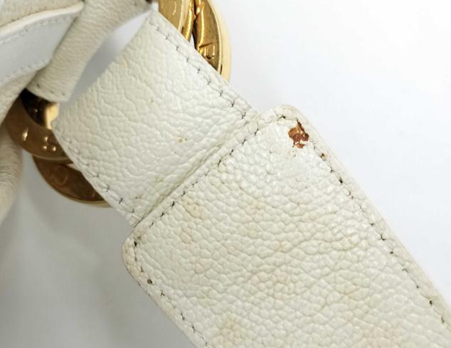 全体ヤケシミ(小) 角縁擦れ(中) 金具擦れ傷くすみ(中) 持ち手カビシミ汚れ(中) ファスナーエンドボンド染み有 内側擦れ(小) におい(小)鑑定済み正規品