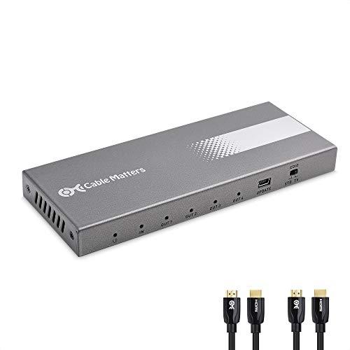 【1入力4出力HDMIスプリッタ】HDMI分配器にて単一のHDMIソースから最大4台のHDMI ディスプレイで同時に表示できます。HDMI ハブはブルーレイプレーヤー、ビデオストリーマ、ゲーム機、セットトップボックス、又はパソコンからのオーディオ及びビデオ出力を異なる場所にあるモニター、プロジェクター、またはテレビに複製します。【HDR&HDCP対応】HDMIスプリッターが色深度を高めるためのハイダイナミックレンジ(HDR)機能をサポートしています。分配機 HDMIがHDCP2.2に対応するため、著作権に保護されたコンテンツを放送できます。【高解像度&高音質】HDMI 分岐器はHDMI 2.0(4:4:4 8bit)に対応できる鮮やかなビデオとリアルなオーディオは、最大3840 x 2160@60 Hz(1080Pを含め)の解像度をサポート;hdmi 分配器はLCPM、Dolby TrueHD、およびDTS HD-Masterオーディオをサポート;HDMI 分配機は2.1、5.1、及び7.1サラウンドサウンドのオーディオをサポートします。【優れた安定性】付属されたAC電源アダプタはHDMI 分配器 4出力を給電でき、高消費電力のディスプレイであっても安定した映像を出力することができ、電源供給不足による映像の乱れや途切れなども回避可能で、より迅速かつ安定な信号伝送を保証します。金メッキのHDMIポートと頑丈な金属製ハウジングが含まれており、EMI / RFI干渉を低減し、鮮明な画像を実現できます。hdmiハブは家庭での映像のシェアはもちろん、会議室でのプレゼンテーションなど幅広いシーンにおいて大活躍です。【パッケージリスト&一年間の保証期間】パッケージリスト:1x 4ポートHDMIスプリッタ(hdmi splitter)、1x AC 電源アダプタ、2x 取付金具と8x 取り付けネジ、2x HDMIケーブル、1x 日本語の取扱説明書。付属の金具とネジで本体を取り付けできます。2本4K HDMIケーブルが付属されます。一年間の保証期間をつけております。