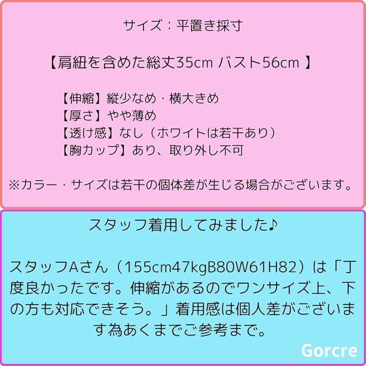 平置き採寸:肩紐を含めた総丈35cm バスト29cm カップ取り外し不可 生地:薄手、伸縮性あり *商品画像と実際のカラーは、撮影の状況・モニターの表示等により若干異なる場合がございます。