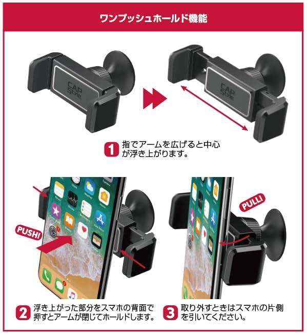 指でアームがロックするまでを拡げて、スマホの背面でボタンを押すとスマホが自動的にホールド。簡単&しっかりホールドします。