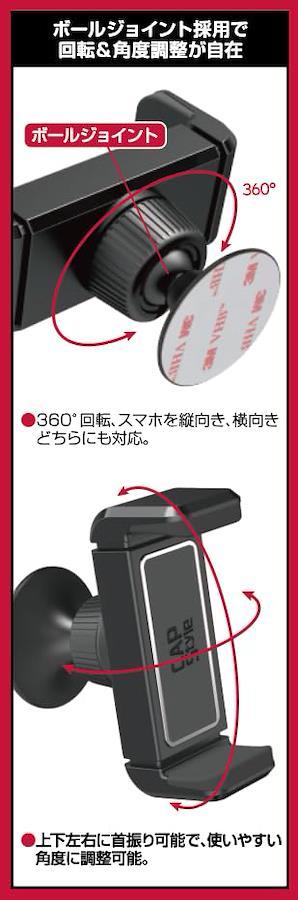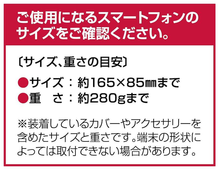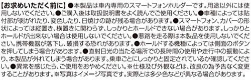 ●本製品は車内専用のスマートフォンホルダーです。用途以外には使用しないでください。●ご購入後は取扱説明書をよく読んでご使用ください。●車種によっては貼付部が剥がれたり、変色したり、日焼けの跡が残る場合があります。●スマートフォン、カバーの形状によっては縦置き、横置きに関わらず、しっかりとホールドできない場合があります。しっかりとホールドが出来ない場合は使用しないでください。●悪路を走る際は本製品を使用しないでください。携帯機器が落下し、破損する恐れがあります。●ホールドする機種によっては側面のボタンを押してしまう場合があ