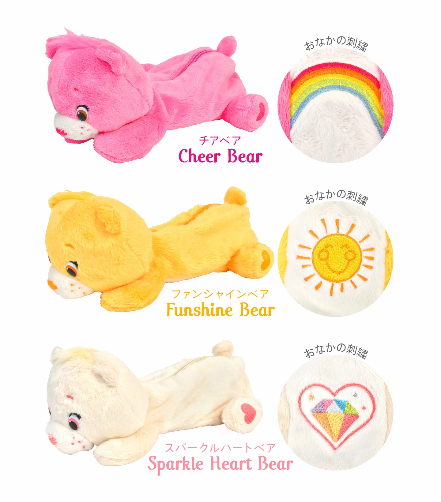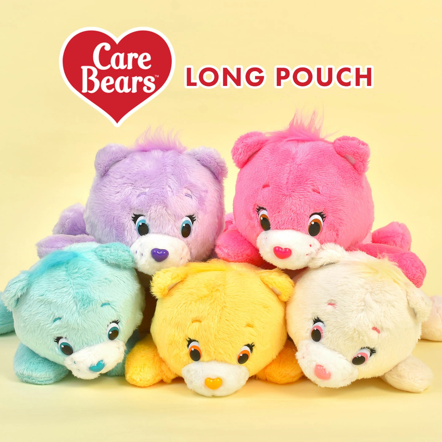 【ロングポーチ】ぬいぐるみペンケースにケアベアが登場!ふわふわな触り心地のぬいぐるみ生地を使用して存在感抜群。おなかにはそれぞれかわいい刺繍が入っています♪15cm定規などの文房具も入るサイズ感で、ペンケースや小物入れにぴったりです。