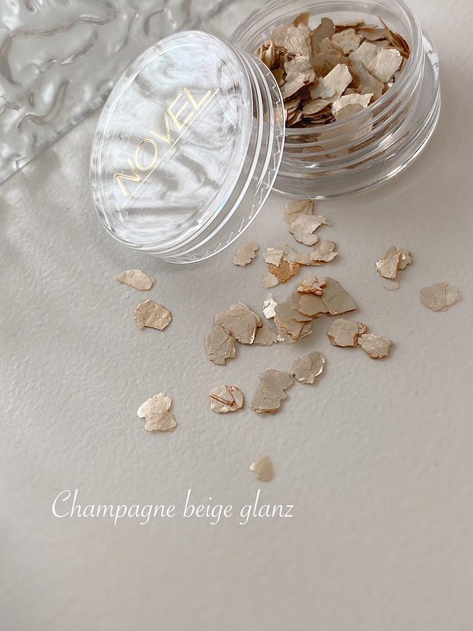 サテンのような上品なシャンパンベージュの色味と光沢が美しいマイカフレークになります。グリッターの上にワンポイントで散らしたり、シェルとの相性も抜群です。シーズン問わずお使い頂きやすいアイテムになります。