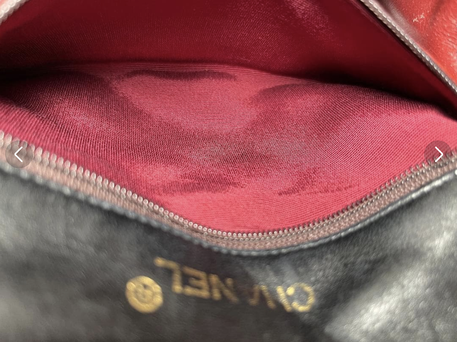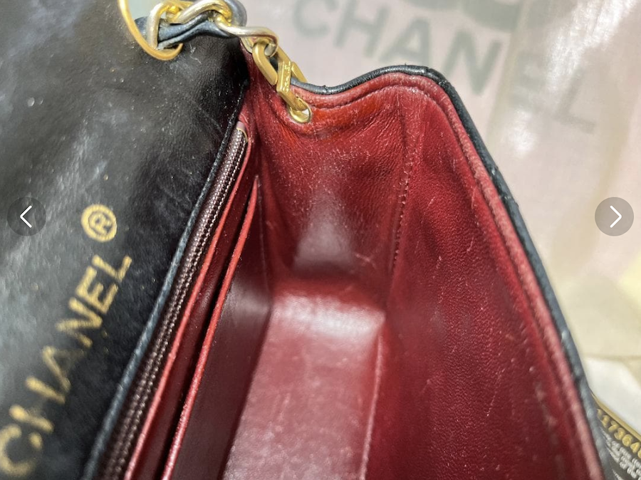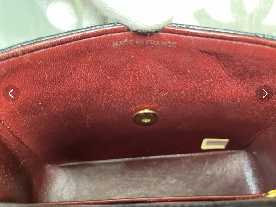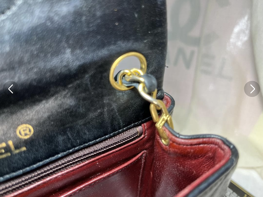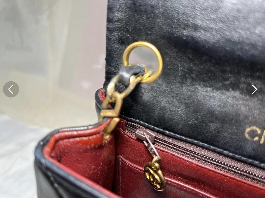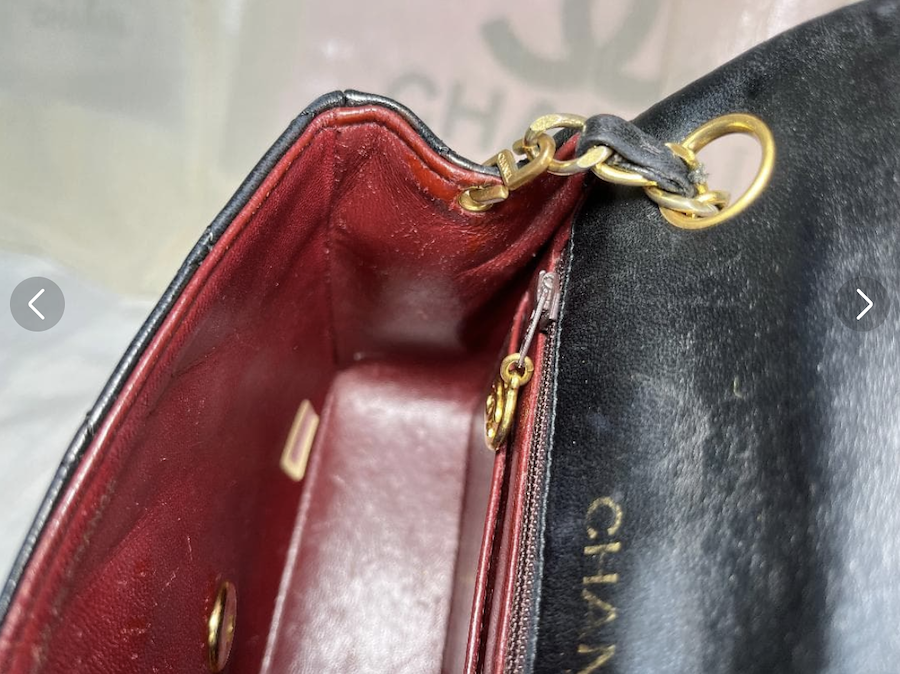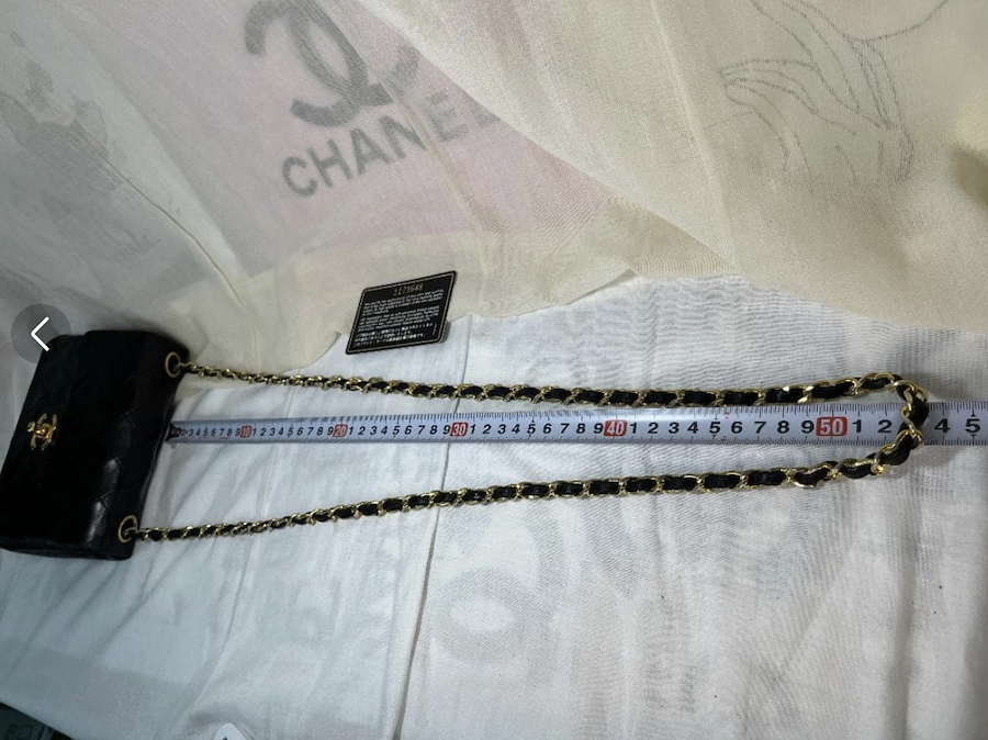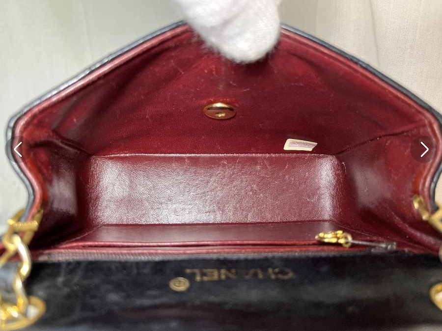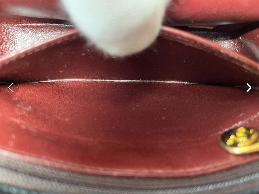 使用感はあるものの革の状態は良く、金具もゴールドの輝きを保っています。斜め掛けできる110cmチェーンは実用性も高めです。