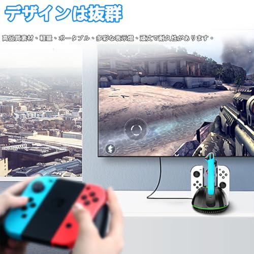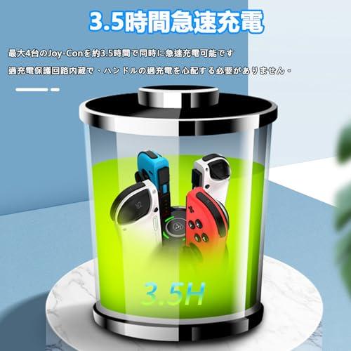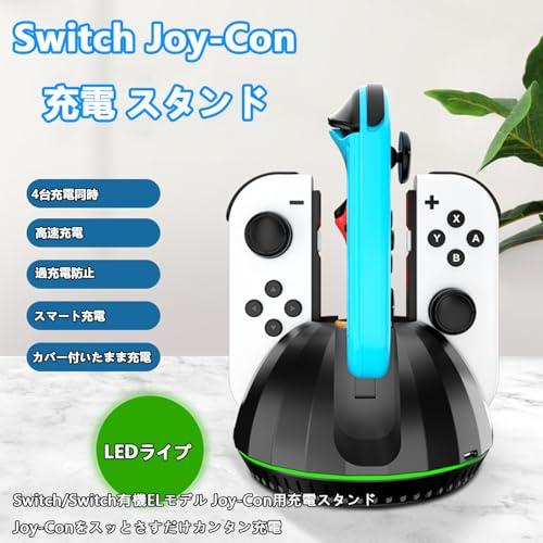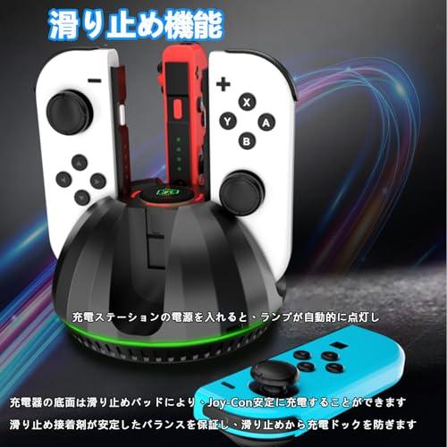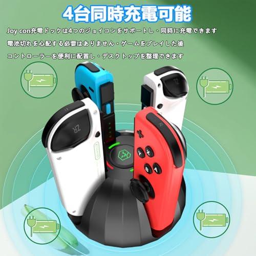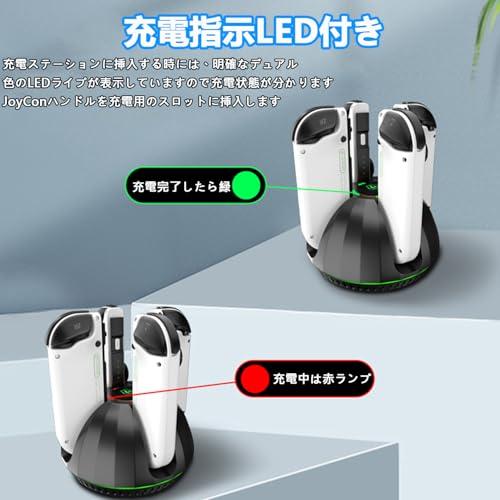 【Switch Joy-Con専用充電器】Switch/Switch有機ELモデル Joy-Con用充電スタンド、Joy-Conをスッとさすだけカンタン充電。製品はコンパクトでシンプルで操作が簡単で、一体型なのでスペースを取らずスッキリ収納充電!Switch ゲーマーにとって、これは必須のJoy-Con充電ドックです。(Switch、Joy-Conは含まれません。) 【充電指示LED】充電ステーションに挿入する時には、明確なデュアル色のLEDライプが表示していますので充電状態が分かります。 JoyConハンドルを充電用のスロットに挿入します。指示ランプがついており、充電中は赤ランプ、充電完了したら緑ランプがつくのでひと目で充電完了を確認する事ができて便利です。 【3.5時間急速充電】公式ACアダプターにて最も速い充電速度を提供し、入力電圧は5V/2Aで、最大4台のJoy-Conを約3.5時間で同時に急速充電可能です。従来品より、1.5倍充電スピードが向上します。※ご使用の充電環境によって多少異なります。充電と収納が1つに, Joy-Conを充電したり、ジョイスティックの収納スタンドとして使用できます。 【デザインは抜群・滑り止め機能】簡単にスライドインできるデザイン、プラグアンドプレイ。高品質素材、軽量、ポータブル、多彩な表示燈、頑丈で耐久性があります。充電器の底面は滑り止めパッドにより、Joy-Con安定に充電することができます。滑り止め接着剤が安定したバランスを保証し、滑り止めから充電ドックを防ぎます。 【過充電防止】充電保護システムにより、過充電、過放電、過熱または短絡に対する対策機能がついており、パワフルかつ安全な充電を可能にします。また充電が完成した時、自動的に電源切れになり、過充電防止を確保する。ゲームをプレイした後、コントローラーを便利に配置し、デスクトップを整理できます。
