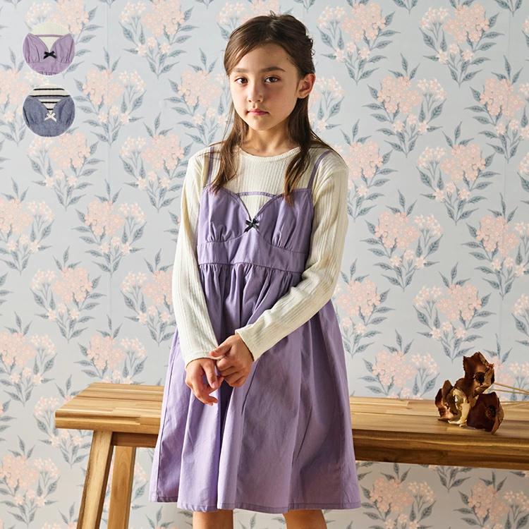 Tシャツとキャミワンピースのレイヤード風ワンピース。Tシャツ部分はテレコ素材で、柔らかく着心地が良いです。スカート部分の左側がプリーツの、アシンメトリーデザインになっています。大人っぽいデザインで、1枚でトレンド感あるスタイルの出来上がり!【アイテム】トップス シンプル ガーリー フェミニン カジュアル お洒落 オシャレ かわいい 可愛い 普段着 デイリーウェア お出かけ着 お外着 お外遊び着 子ども こども 女児 女の子 ガールズ キッズ ベビーサイズ トドラーサイズ 幼稚園 保育園 小学校 通園 通学 小学生 2024年秋冬物新作 丸高衣料 ラベンダー コン 紺 クレセント