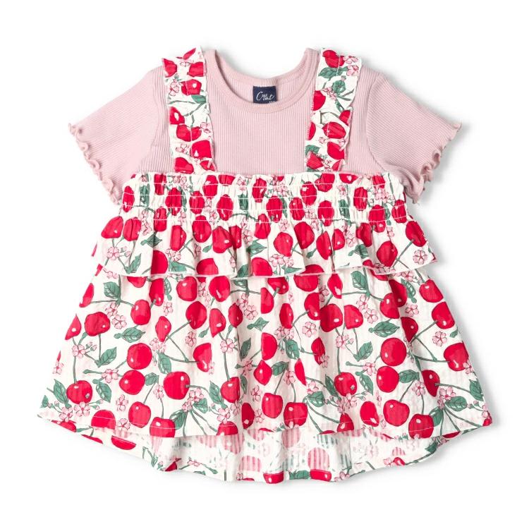 サクランボとレモン柄のサッカー素材のキャミを半袖Tシャツにドッキングしたデザイン。1枚で重ね着が楽しめる半袖Tシャツ。胸のシャーリングデザインも可愛い!同じフルーツ柄を使ったチュニックTシャツ(N44893)、ワンピース(N44393)があるので、姉妹やお友達とお揃い、ペアコーデ、リンクコーデもおすすめ!おそろいアイテムはギフトやプレゼントにも人気です!【アイテム】トップス シンプル ガーリー フェミニン カジュアル お洒落 オシャレ かわいい 可愛い 普段着 デイリーウェア お出かけ着 お外着 お外遊び着 子ども こども 女児 女の子 ガールズ キッズ ベビーサイズ トドラーサイズ 幼稚園 保育園 小学校 通園 通学 小学生 2025年春夏物新作 丸高衣料 姉妹 お揃い オソロ おそろい お揃いリンク リンクコーデ ペアルック レッド 赤色 イエロー 黄色 れもん 檸檬 さくらんぼ チェリー フルーツ 果物 クレセント コットン100% 綿100%