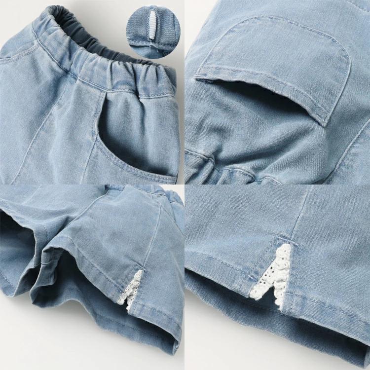 ストレッチデニム素材の2分丈ショートパンツ。どんなアイテムとも合わせやすい!シフォンのリボン付きデザイン、スリットレース使いのデザイン、裾レースのデザインの3デザイン展開。【アイテム】ナチュラル シンプル ベーシック フェミニン ガーリー 無地 カジュアル お洒落 オシャレ かわいい 大人可愛い 普段着 デイリーウェア お出かけ着 お外着 外遊び着 ハーフパンツ 短パン 半パン 半ズボン ボトムス 子ども こども 女児 女の子 ガールズ キッズ ベビーサイズ トドラーサイズ 幼稚園 保育園 小学校 通園 通学 小学生 2024年春夏物新作 丸高衣料 ショートパンツ ショーパン デニム ジーンス Gパン りぼん コン ネイビー 紺色 サックス 水色 クレセント