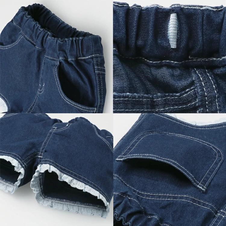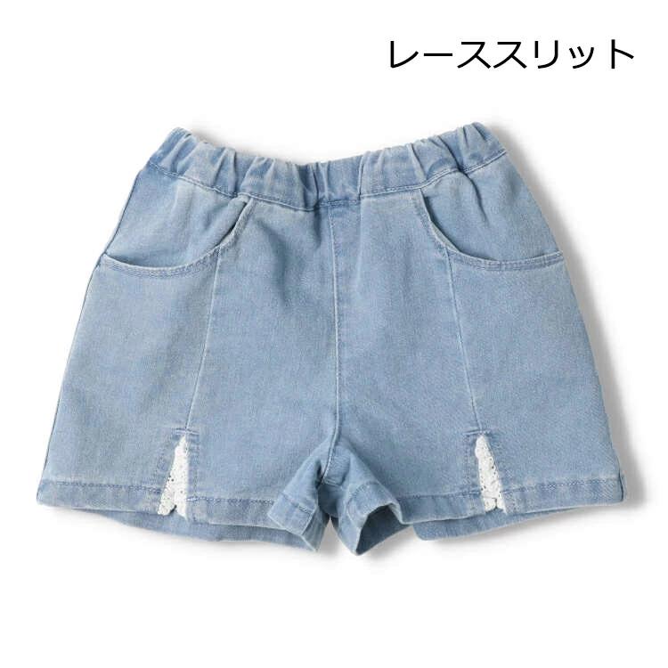 ストレッチデニム素材の2分丈ショートパンツ。どんなアイテムとも合わせやすい!シフォンのリボン付きデザイン、スリットレース使いのデザイン、裾レースのデザインの3デザイン展開。【アイテム】ナチュラル シンプル ベーシック フェミニン ガーリー 無地 カジュアル お洒落 オシャレ かわいい 大人可愛い 普段着 デイリーウェア お出かけ着 お外着 外遊び着 ハーフパンツ 短パン 半パン 半ズボン ボトムス 子ども こども 女児 女の子 ガールズ キッズ ベビーサイズ トドラーサイズ 幼稚園 保育園 小学校 通園 通学 小学生 2024年春夏物新作 丸高衣料 ショートパンツ ショーパン デニム ジーンス Gパン りぼん コン ネイビー 紺色 サックス 水色 クレセント
