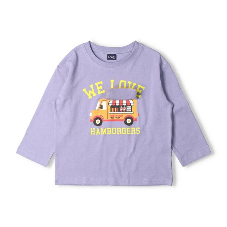 フードトラックのフラップ部分をめくると開店中のお店の様子に早変わり。仕掛けが楽しい長袖Tシャツ、ロンT。 (ベビーサイズのみ肩ボタン仕様になります。)【アイテム】トップス カジュアル お洒落 オシャレ かっこいい かわいい 可愛い 普段着 デイリーウェア お出かけ着 お外着 お外遊び着 子ども服 こども服 男児 男の子 ボーイズ キッズ ベビーサイズ トドラーサイズ 幼稚園 保育園 小学校 通園 通学 小学生 2025年春夏物新作 丸高衣料 ロングスリーブ 長袖 ラベンダー パープル 薄紫色 アイボリー オフホワイト 白色 クレセント カー 車
