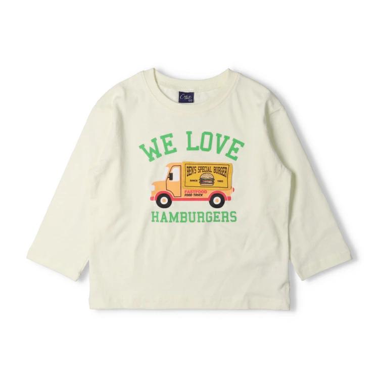 フードトラックのフラップ部分をめくると開店中のお店の様子に早変わり。仕掛けが楽しい長袖Tシャツ、ロンT。 (ベビーサイズのみ肩ボタン仕様になります。)【アイテム】トップス カジュアル お洒落 オシャレ かっこいい かわいい 可愛い 普段着 デイリーウェア お出かけ着 お外着 お外遊び着 子ども服 こども服 男児 男の子 ボーイズ キッズ ベビーサイズ トドラーサイズ 幼稚園 保育園 小学校 通園 通学 小学生 2025年春夏物新作 丸高衣料 ロングスリーブ 長袖 ラベンダー パープル 薄紫色 アイボリー オフホワイト 白色 クレセント カー 車