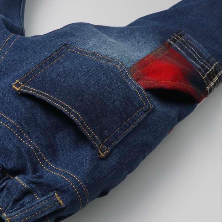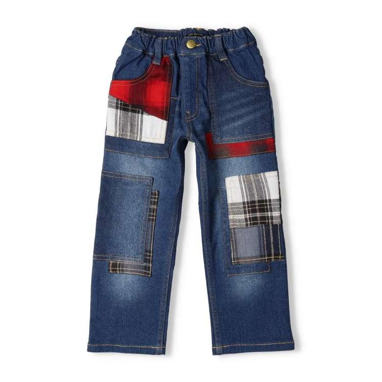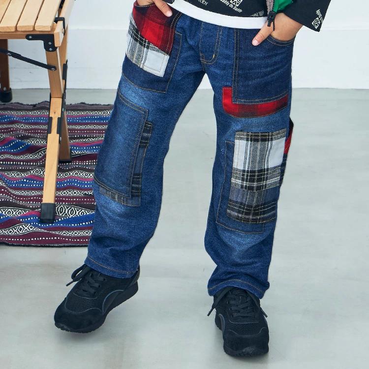 チェック柄とデニムのブロッキングが魅力的なデニムのが長パンツ、長ズボン。柔らかく伸びの良いストレッチデニム生地で、ストレスフリーな履き心地。パッチワーク風のデザインが存在感のあるスタイルを演出します。ラフ感があるゆったりめのストレートシルエットで、トレンド感のあるスタイリングが楽しめます。同じデザインのスクールサイズ(140,150,160cm)はV53015になります。【アイテム】シンプル ベーシック 無地 カジュアル お洒落 オシャレ かっこいい かわいい 可愛い 普段着 お外着 お外遊び着 デイリーウェア お出かけ着 ロング丈 長丈 長ズボン フル丈 ボトムス 子ども こども 男児 男の子 ボーイズ キッズ ベビーサイズ トドラーサイズ 幼稚園 保育園 小学校 通園 通学 小学生 2023年秋冬物新作 丸高衣料 ネイビー コン 紺色 ブルー 青 チェック ダディオダディ