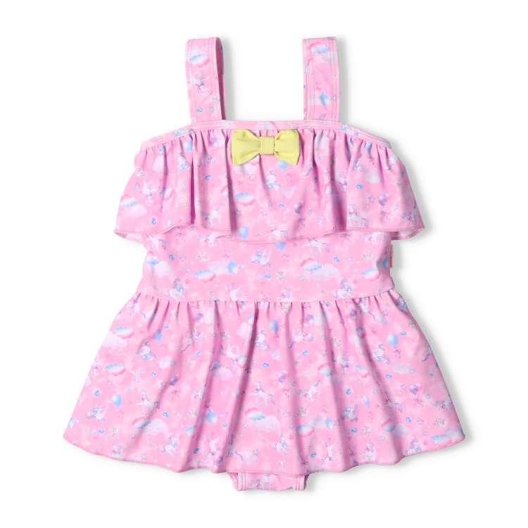 スイミング、プール、海水浴、水遊び、夏に大活躍の水着、スイムウェア。スカート付きのワンピースタイプ。UVカット加工生地を使っています。女の子に大人気のユニコーンの総柄が可愛いアイテム。胸のフリルやリボンのデザインもポイント!【アイテム】雑貨 カジュアル お洒落 オシャレ かっこいい かわいい 可愛い 普段着 デイリーウェア お出かけ 子ども こども 女児 女の子 ガールズ キッズ ベビーサイズ トドラーサイズ 幼稚園 保育園 小学校 小学生 旅行 2024年夏物新作 丸高衣料 キッズフォーレ ピンク サックス 水色 夢可愛い 海水浴 プール