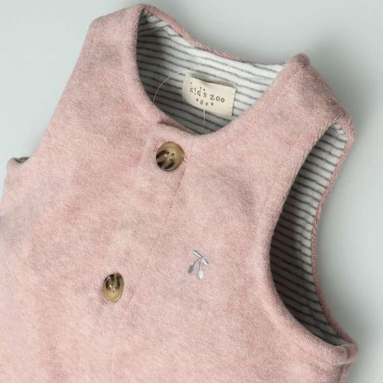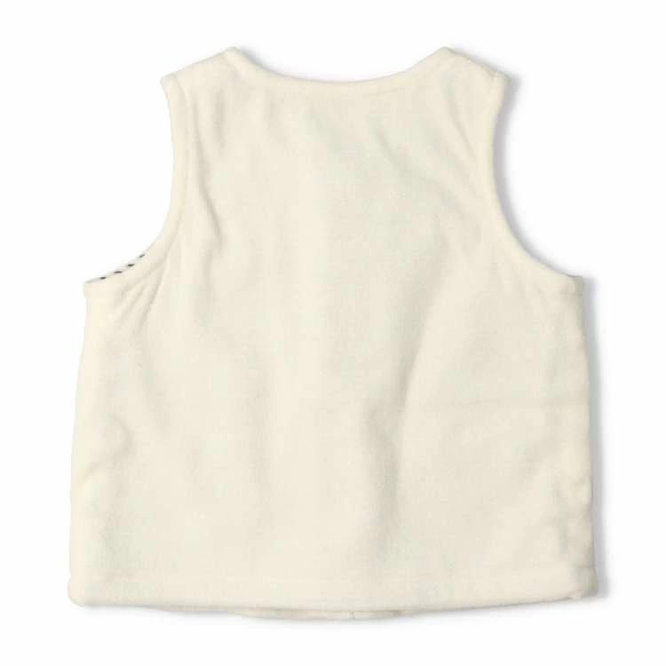 初秋から冬にかけて、1つあるとデイリーに重宝するベスト。暖かみのあるパイル起毛素材を使用し、綿100%スムース素材の裏地付きなので着心地がとてもいいです。左胸のさくらんぼ刺繍がポイント。ベビーの可愛らしさを引き立てるオフホワイトとピンクの2色展開。出産祝い等のベビーギフトにおすすめのアイテムです!【アイテム】プレゼント ギフト 赤ちゃん服 ベビー服 贈り物 トップス 無地 シンプル ガーリー カジュアル お洒落 オシャレ かわいい 可愛い 普段着 デイリーウェア お出かけ着 子ども こども 女児 女の子 ガールズ キッズ ベビーサイズ 幼稚園 保育園通園 2024年秋冬物新作 丸高衣料 オフホワイト ホワイト 白 ピンク キッズズー