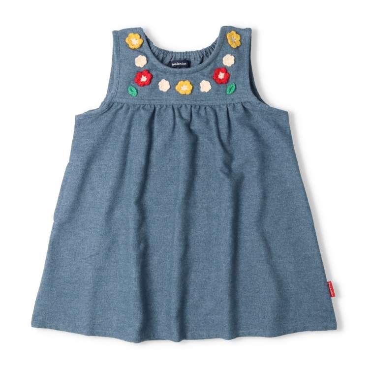 胸元のお花のかぎ針編みモチーフがレトロで可愛らしいジャンパースカート(ジャンスカ)。程よく厚みのある綿100%のネル表起毛素材を使用。 秋はインナーにTシャツやブラウスを合わせて、寒くなってきた冬にはニットやハイネックを合わせて、長いシーズン様々なコーディネートが楽しめる1枚です。首元は後ろがゴム仕様なので、着脱も簡単♪右横に便利なポケット付きです!【アイテム】ナチュラル シンプル ベーシック フェミニン ガーリー 無地 カジュアル お洒落 オシャレ かわいい 大人可愛い 普段着 デイリーウェア お出かけ着 お外着 外遊び着 ボトムス 子ども こども 女児 女の子 ガールズ キッズ ベビーサイズ トドラーサイズ 幼稚園 保育園 小学校 通園 通学 小学生 2024年秋冬物新作 丸高衣料 ネイビー 紺 ベージュ お花 ムージョンジョン コットン100%綿100%