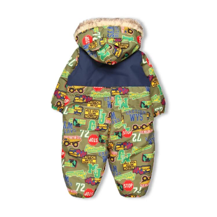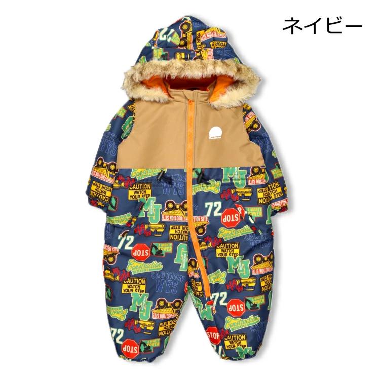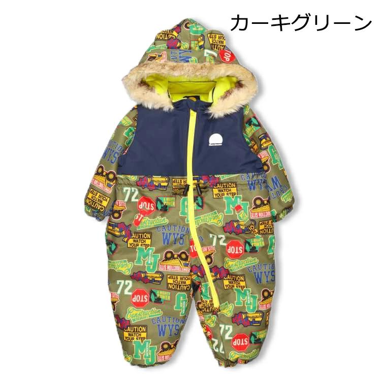 今年もスノーコンビ・ジャンプスーツ・カバーオール・スキーウェア・つなぎを入荷しました♪雪遊びにもおすすめ!!身頃裏地はあったかフリース素材になっています☆足部分は二重構造になっているので、ナイロン部分を中に入れてスノーブーツを履いて、スノーブーツの上から被せると足元から雪が入りにくい!洋服の上から着ることを考え、大き目に作られているので、ジャストサイズをお勧めします。別売りですが、同柄で脚絆、足カバー(M53882)やスノーグローブ、手袋(M53880)もあるので、更なる防寒も可能です!表は耐水圧2000mmの防水加工です!(完全防水ではありません。撥水スプレーとの併用がオススメです。)男の子に人気の働く車にロゴの総柄デザイン。フードには耳付きで可愛い!【アイテム】 カジュアル お洒落 オシャレ かっこいい かわいい 可愛い 普段着 デイリーウェア お出かけ着 ロングスリーブ 長袖 アウター ブルゾン ジャンパー コート ジップアップ フロントジップ 子ども こども 男児 男の子 ボーイズ キッズ ベビーサイズ トドラーサイズ 幼稚園 保育園 小学校 通園 通学 小学生 2024年秋冬物新作 丸高衣料 ネイビー 紺色 カーキグリーン 深緑色 スキー スノーボード ムージョンジョン 工事車両 建機 ブルドーザー