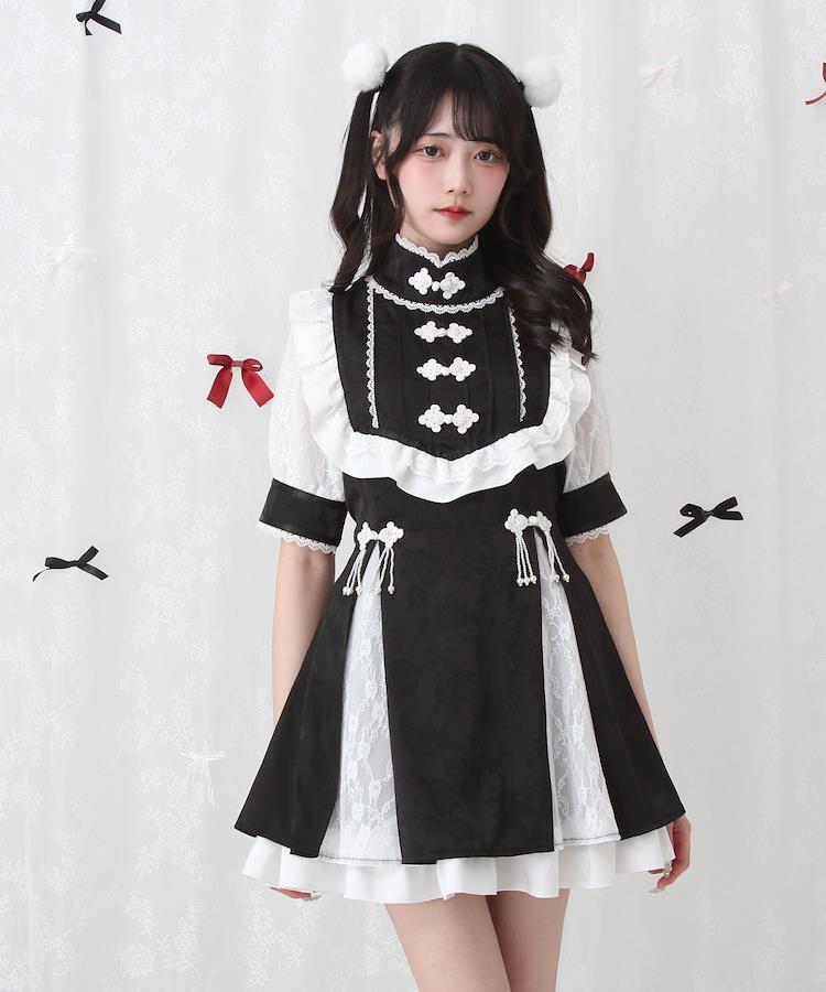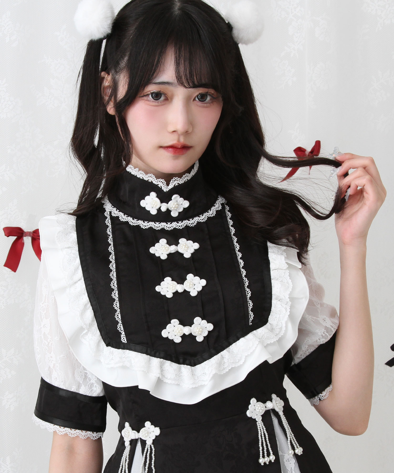 パールチャイナ釦で遊び心をプラスし、スカートはレース生地とのキュートな切り替えデザイン
