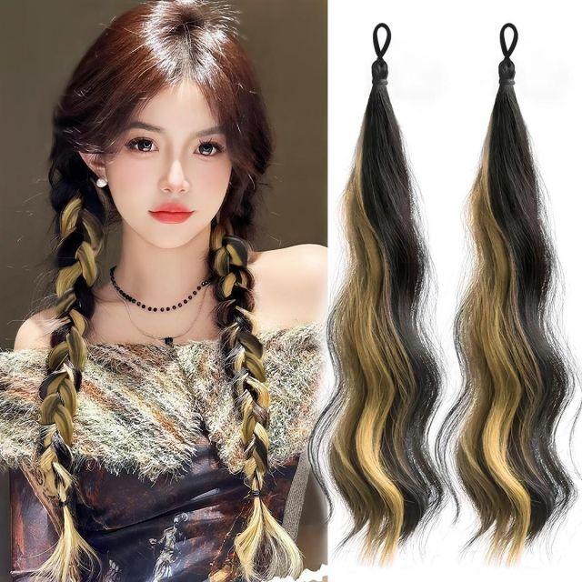 スタイル:三つ編み◆商品名:Chisaflyエクステ子供ヘアエクステポニーテールウィッグ2本ロングカール巻き髪金髪耐熱ゴム付きレディース三つ編みお団子ダンス(金)