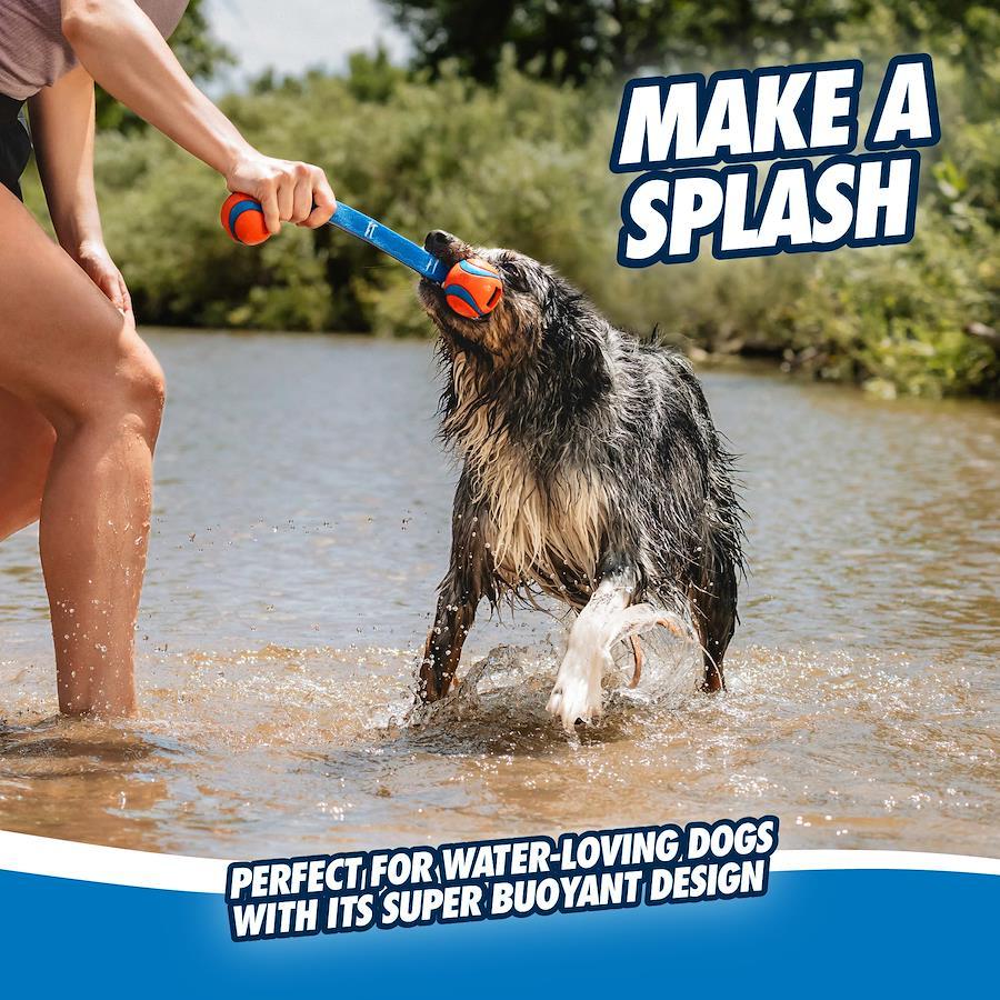 Launcher compatible rugged rubber tug and toss toy designed around the best-selling Chuckit Ultra ball.