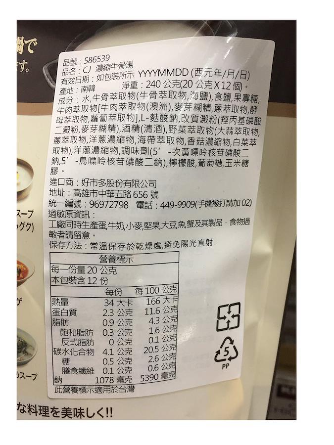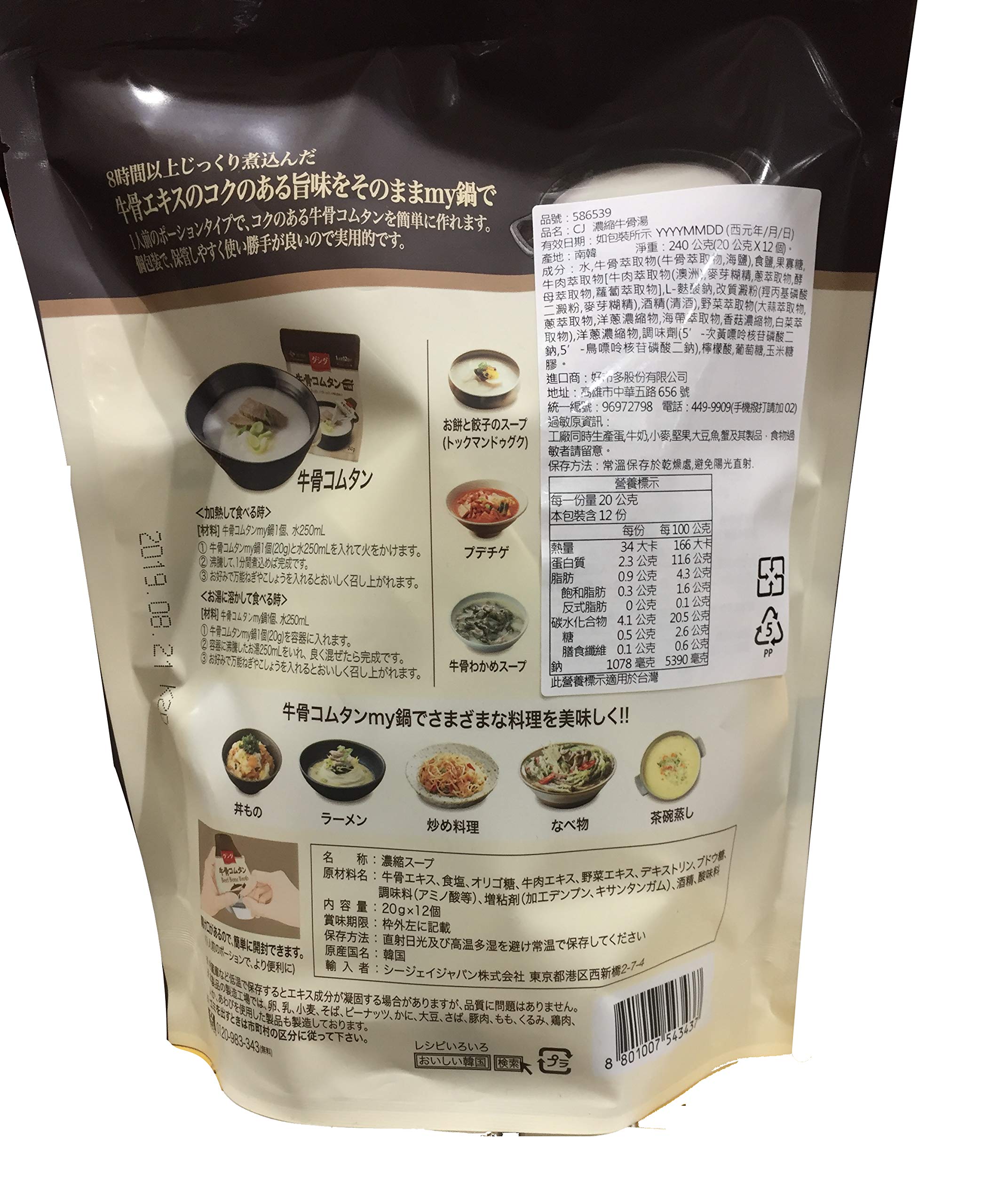 ・ダシダ 牛骨コムタンスープ 20g×12個入 1ポーションで1食がパッと手軽に! ・8時間以上じっくり煮込んだ。 ・牛骨エキスのコクのある旨味をそのままmy鍋で。 ・1人前のポーションタイプで、コクのある牛骨コムタンを簡単に作れます。 ・個包装で、保管しやすく使い勝手が良いので実用的です。!#586539:CJ ダシダ 牛骨コムタンスープ 20g×12個入(240g) 。ダシダ Since 1975。1人前 × 12個入り。ポーションタイプ1つで1食。Beef Bone Broth。コク深いコムタンの味を簡単に!!。1ポーションで1食がパッと手軽に!!。Quick & Easy !!。8時間以上じっくり煮込んだ。牛骨エキスのコクのある旨味をそのままmy鍋で。1人前のポーションタイプで、コクのある牛骨コムタンを簡単に作れます。個包装で、保管しやすく使い勝手が良いので実用的です。牛骨コムタンmy鍋でさまざまな料理を美味しく!!丼もの、ラーメン、いため料理、なべ物、茶碗蒸し。名称:濃縮スープ。原材料名:牛骨エキス、食塩、オリコ糖、牛肉エキス、野菜エキス、デキストリン、ぶどう糖、調味料(アミノ酸等)、増粘剤(加工デンプン、キサンタンガム)、清酒、酸味料。内容量:20g×12個(240g)。賞味期限:枠外に記載。保存方法:直射日光および高温多湿を避け常温で保存してください。原産国:韓国。輸入者:シージェイジャパン株式会社 東京都港区西新橋。※パッケージデザインが変更になりことがあります 外箱サイズ:約185*230*40mm。