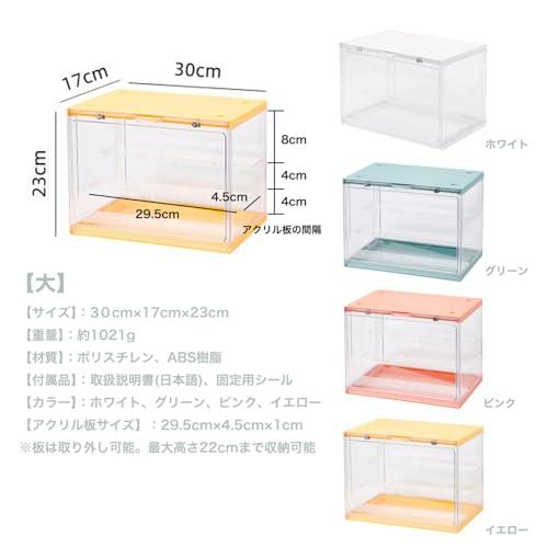 【?大切なコレクションを飾るのにぴったりなアクリルケース】フィギュア、ぬいぐるみ、アイドルやアーティストなどの推しグッズ、バッグや時計・帽子などのファッション雑貨、香水、記念品など様々なアイテムを保管&飾るのに最適です。 【?劣化予防に】変色や汚れなどを防ぎつつ飾って楽しむことができます。見せる収納ができる便利アイテムです。 【?マグネット式前扉&固定用シール付き】片手でも簡単に開ける磁石付き前扉です。ドアは90度まで開けることができるので出し入れもスムーズ♪また、中身が倒れたり動いたりしないように固定用のテープが付属しています。 【?カラーバリエーション豊富】シンプルなホワイトをはじめ、ピンク・イエロー・グリーンの全4色。インテリアや推しメンカラーに合わせるのもオススメです★ ※万が一、初期不良があった場合は当店にご連絡ください(お客様の不注意・過失の場合はご対応しかねる場合がありますことをご了承ください)※モニターによって色味が実物とやや異なる場合がございます。※生産工程上、微量なサイズ・重量の個体差がある場合がございます。ご了承ください。