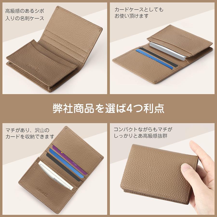 【上質な本革製名刺入れ】この名刺ケースは柔らかく、耐久性に優れた本革を使用して、外側も内側も全て同一のレザーで美しい統一感を演出いたしました。なめらかな裏地でカードの出し入れもスムーズに行えます。ポケットはカーブポケット以外は「深め」かつ「広め」に設計。カーブポケット以外に収納したカードは見えないので、すっきりとスマートな印象に。 【5つのポケット・仕分けできる】この名刺ケースはメインポケット以外にも、4カ所のポケットがあって、サイドはWマチで引っ掛かることなくスムーズに取り出せます。5つのサブポケットがあるので、今すぐ欲しい名刺がサッと取り出せる。ご自身の名刺と頂いた名刺が混在する心配がなくて、クレジットカードや定期入れ等を常備する事で便利にお使い頂けます。ICカードはもちろん、お好きなカード・写真・名刺など、安心して入れられ、スマートに収納しておくことができます。 【大容量・50枚収納可能】本名刺入れは安心の収納力でビジネスシーンもしっかり決まって、Wマチで最大50枚名刺収納可能!マチ付きのメイン収納で大容量を確保ボックス型で型崩れしにくいのでたくさんの名刺をキレイに持ち連べます。 【コンパクトな手のひらサイズ】本名刺入れのサイズ:11*7.8*1.8cm、コンパクトで、手に馴染やすい、丁度いいサイズ感男性・女性どちらにも使いやすく、サイズ感胸ポケットにもミニバッグにも収納できます。 【バリエーション豊富な全6色】この名刺入れは綺麗な5カラー[ブラック/ブラウン/グレージュ/ピンク/ダークグリーン/トープ]が用意して、色の選ぶのが楽しくて、本革の質感が引き立つ美しい色味で、あなたにピッタリの色が見つかります。ビジネスファッションに合う渋い色あいで、革の持つ豊かな表情と質感を存分に楽しむ事が出来ます。男女兼用、ユニセックスで使えるから、男女お揃いにしてのご仕様も素敵です。自分使用は勿論、贈り物としても喜ばれるでしょう。