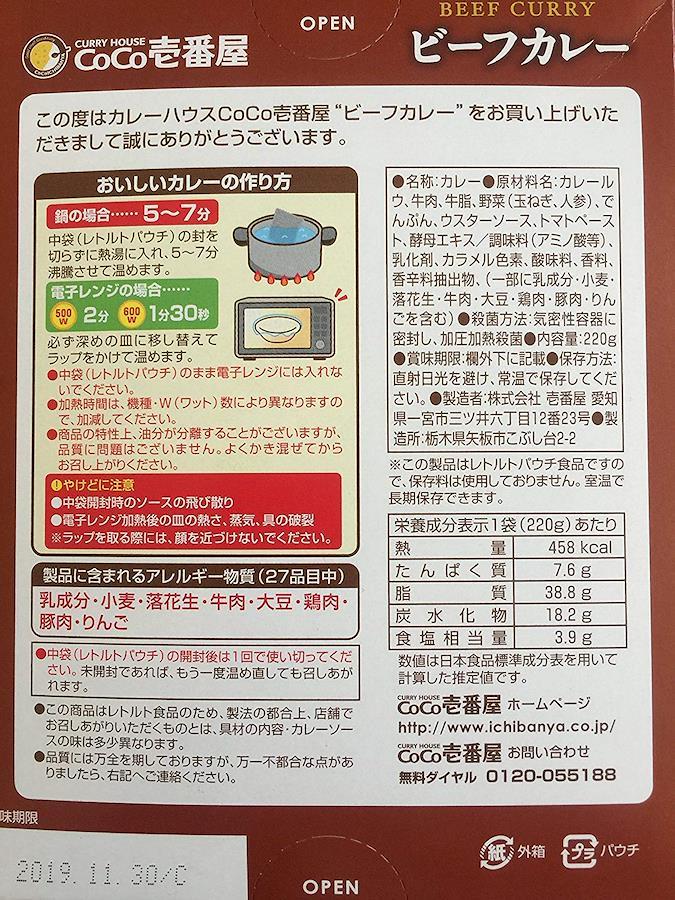 名称:カレー原材料名:カレールー、牛肉、牛脂、野菜(玉ねぎ、人参)、でんぷん、ウスターソース、トマトペースト、酵母エキス/調味料(アミノ酸等)、乳化剤、カラメル色素、酸味料、香料、香辛料抽出物(一部に乳成分、小麦・落花生・牛肉・大豆・鶏肉・豚肉・りんごを含む)殺菌方法:気密性容器に密封し、加圧加熱殺菌内容量:220g製造者:株式会社 壱番屋【重要】メーカーによる商品リニューアルに伴いパッケージ(内容量も含む)変更が行われた場合、新パッケージでお届け致します事ご了承願います。