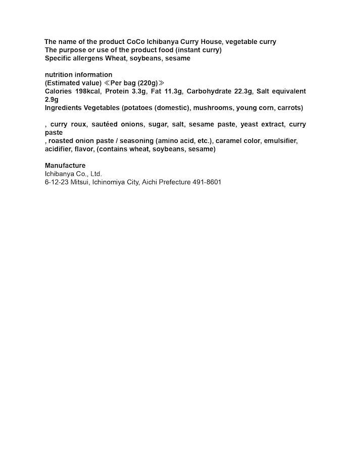 名称:カレー原材料名:野菜(じゃがいも、マッシュルーム、ヤングコーン、人参)、カレールウ、オニオンソテー、砂糖、食塩、ねりごま、酵母エキス、カレーペースト、ローストオニオン/調味料(アミノ酸等)、カラメル色素、乳化剤、酸味料、香料、(一部に小麦・大豆・ごまを含む)殺菌方法:気密性容器に密封し、加圧加熱殺菌内容量:220g製造者:株式会社 壱番屋【重要】メーカーによる商品リニューアルに伴いパッケージ(内容量も含む)変更が行われた場合、新パッケージでお届け致します事ご了承願います。