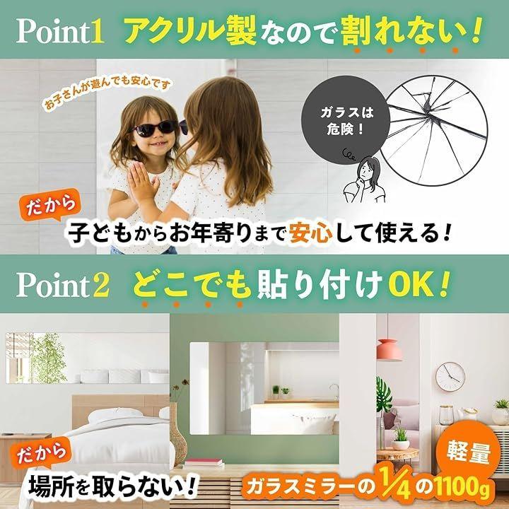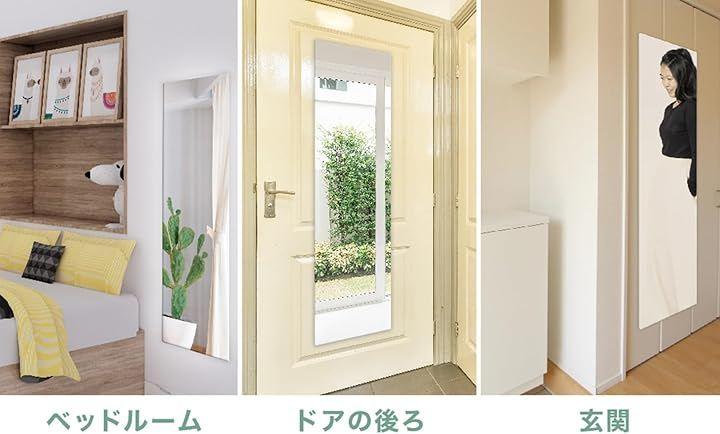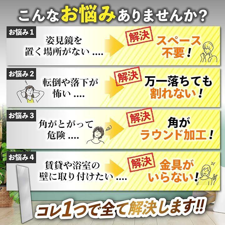 v「新登場、1枚で140cm」お客様のご要望に答え、一枚で姿見に使える大きいサイズが新登場。つなぎ目がないので貼りやすくつなぎ目のずれがありません。