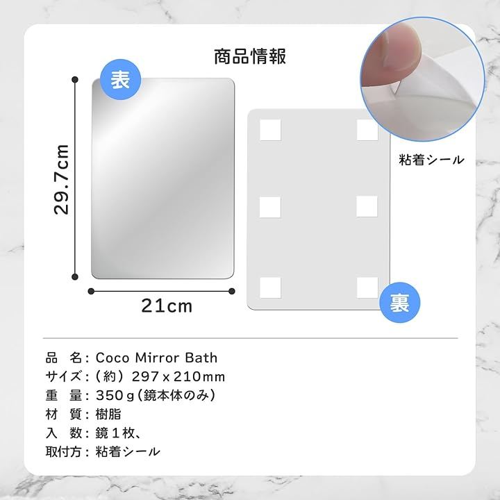 「商品基本仕様」ココミラーCocoMirror購入のお客様の要望におこたえして、浴室専用の割れない鏡、CocoMirror Bath を開発いたしました。