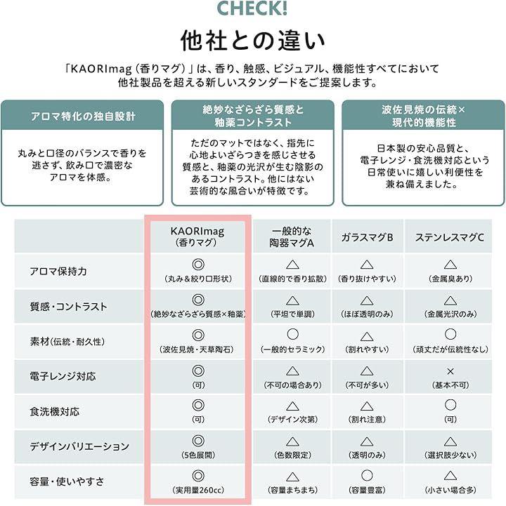 容量:満水時360cc/実用量260cc(8分目)で飲みやすいサイズ 素材:天草陶石主体ブレンド陶土による硬質で丈夫な波佐見焼素地 対応:電子レンジ・食洗機OKで手軽なお手入れ 表面仕上げ:絶妙なざらざら質感のマットな表面と、釉薬が織りなすコントラスト カラーバリエーション:ブルー、ピンク、イエロー、ブラック、ホワイト 快適な使い心地と芸術的な表情を両立した「香りマグ」が、あなたのテーブルを特別な空間に変えます。