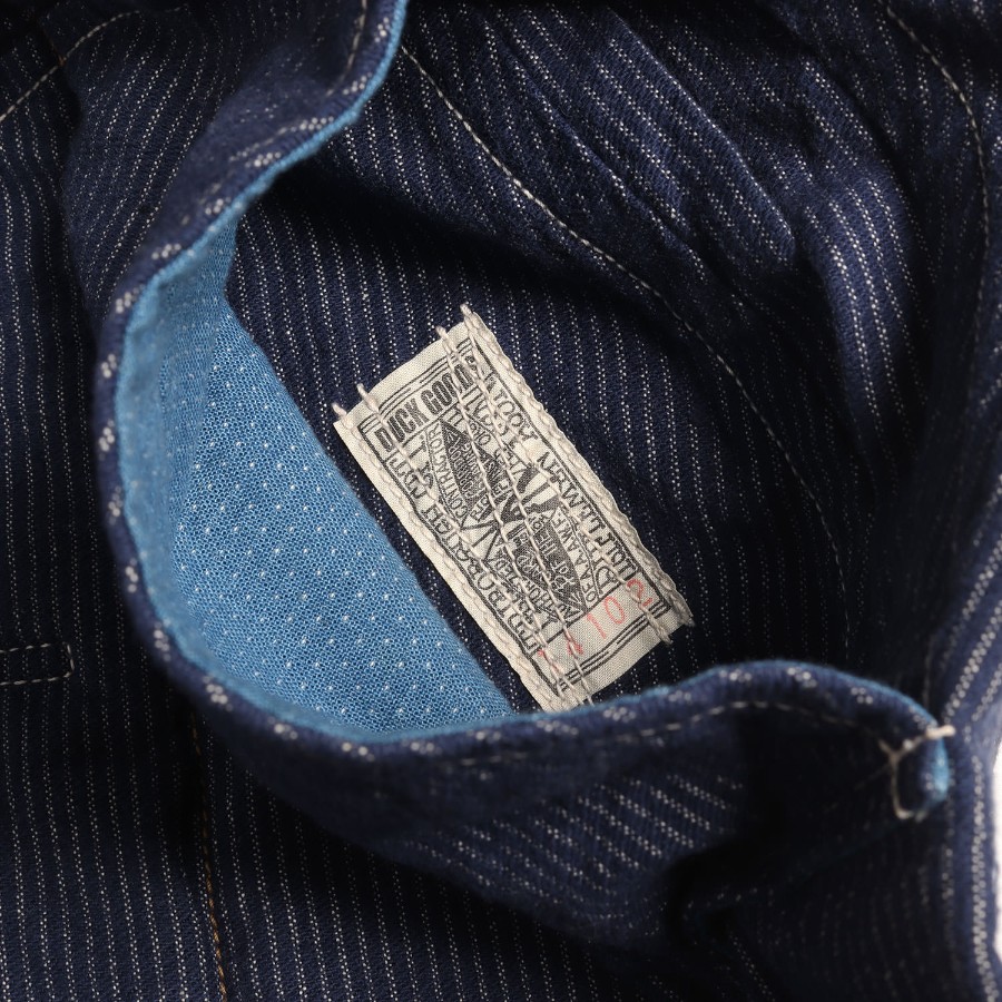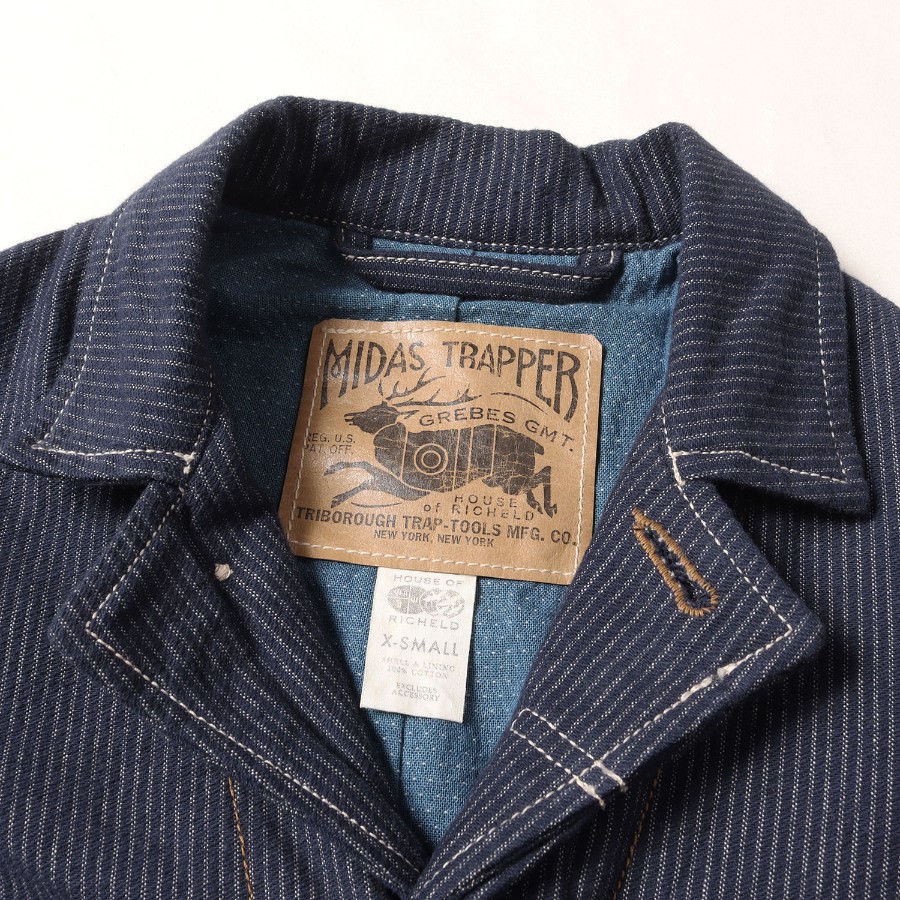 | 商品説明 | ・MIDAS TRAPPERライン ・ディアハンティングに使用されていたシェルコートをモチーフ ・表地 アーリーストライプ柄インディゴコットン生地 ・裏地 ドット柄ジャガード生地 ・貫通ポケット ・比翼ボタン ・猫目ボタン ・ワンウォッシュ済 |