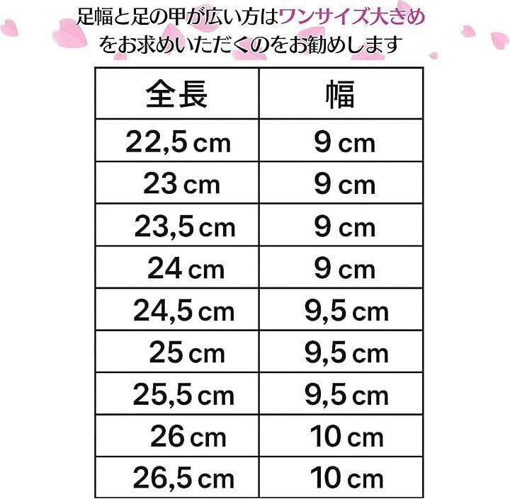 サイズ:22.5cm 全長:22.5cm 幅:9cm/23cm 全長:23cm 幅:9cm/23.5cm/24cm 全長:24cm 幅:9cm/24.5cm 全長:24.5cm 幅:9.5cm/25cm 全長:25cm 幅:9.5cm/25.5cm