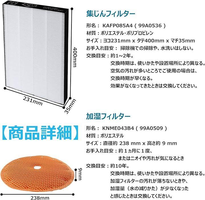 「形名」 集塵フィルター KAFP085A4 / 加湿フィルター KNME043B4 。