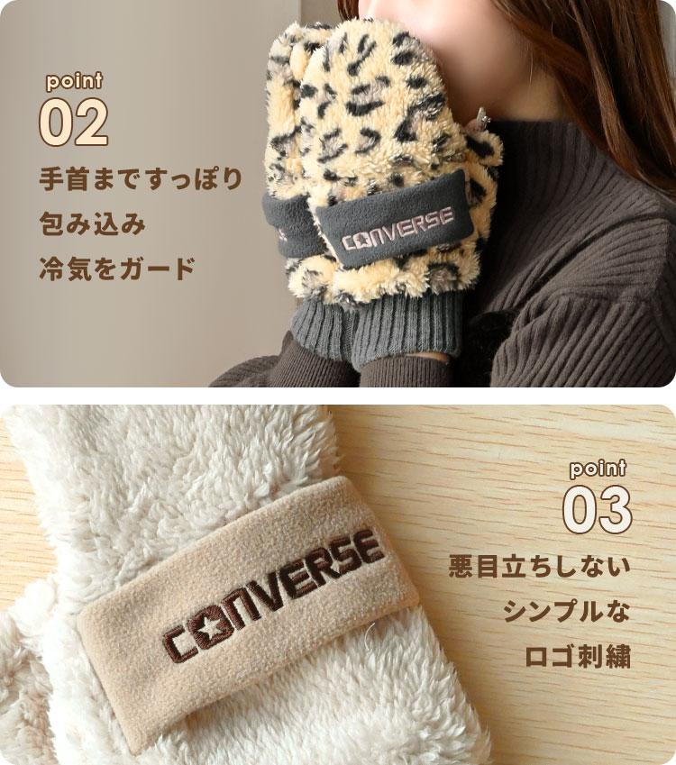 【フリースバンド付きボアミトン】通学通勤やお出掛けなどの防寒グッズとして大活躍すること間違いなし!もこもこのボア素材とリブの組み合わせが可愛いconverseの手袋が登場です♪バンド部分のロゴ刺繍がアクセントとなりカジュアルな雰囲気に。指が出せる2WAYタイプで、スマホ操作も素早くできるので実用性もしっかりあります。ご家族や恋人へのプレゼントにもおすすめです!