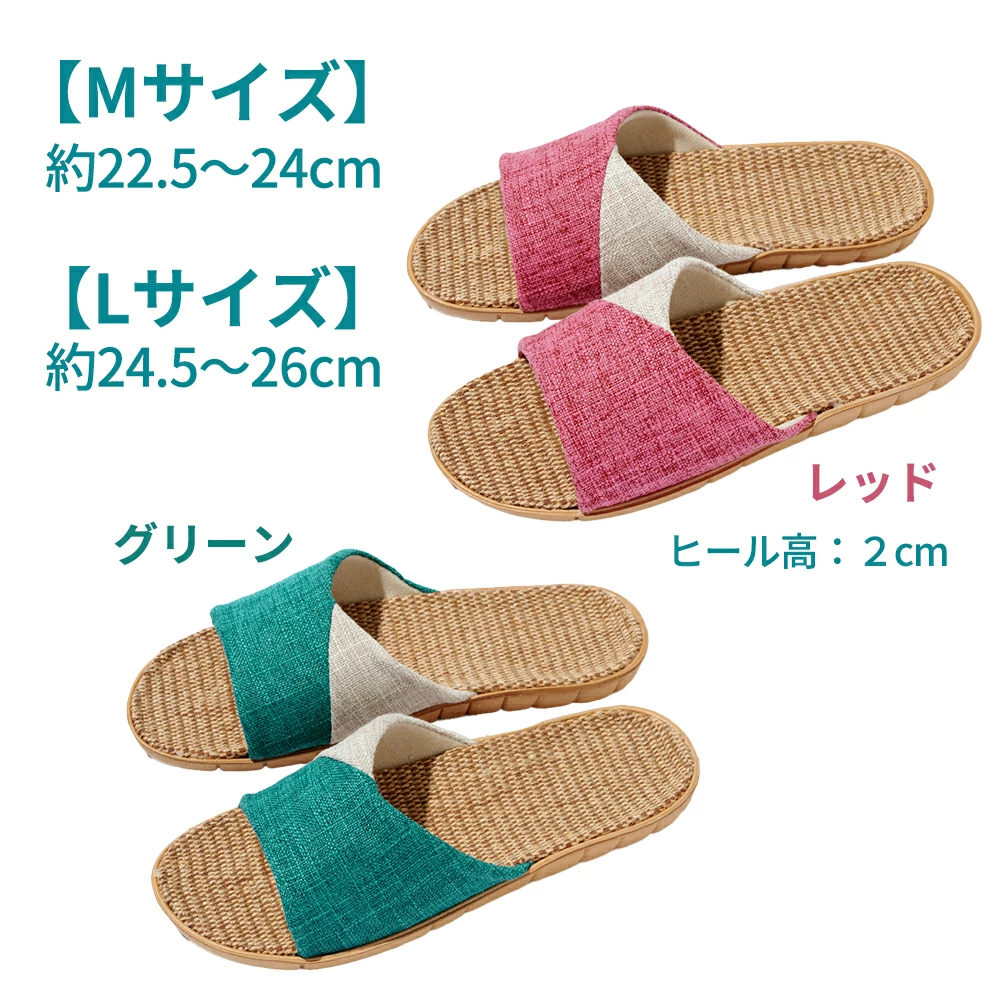 【商品名(JAN)】涼感切替デザインスリッパ グリーンM BCAM23000(4969354027674)涼感切替デザインスリッパ レッドM BCAM23000(4969354027681)涼感切替デザインスリッパ グリーンL BCAM24003(4969354028091)涼感切替デザインスリッパ レッドL BCAM24003(4969354028107)【適応サイズ(約)】M:約22.5~24cmL:約24.5~26cmヒール高:2cm【重さ(片足)】M:75gL:90g【材質】甲:ポリエステル中板:植物繊維(ジュート)・ポリエステル綿・その他底:EVA樹脂【製造国】中国【商品情報】インソールが指先・かかと・土踏まずと足形にそって形成されており、中敷はジュート素材なので履き心地がよいです。また素足で履いても蒸れにくく暑い季節も快適に過ごせます。洗えません。カラー:グリーン・レッド