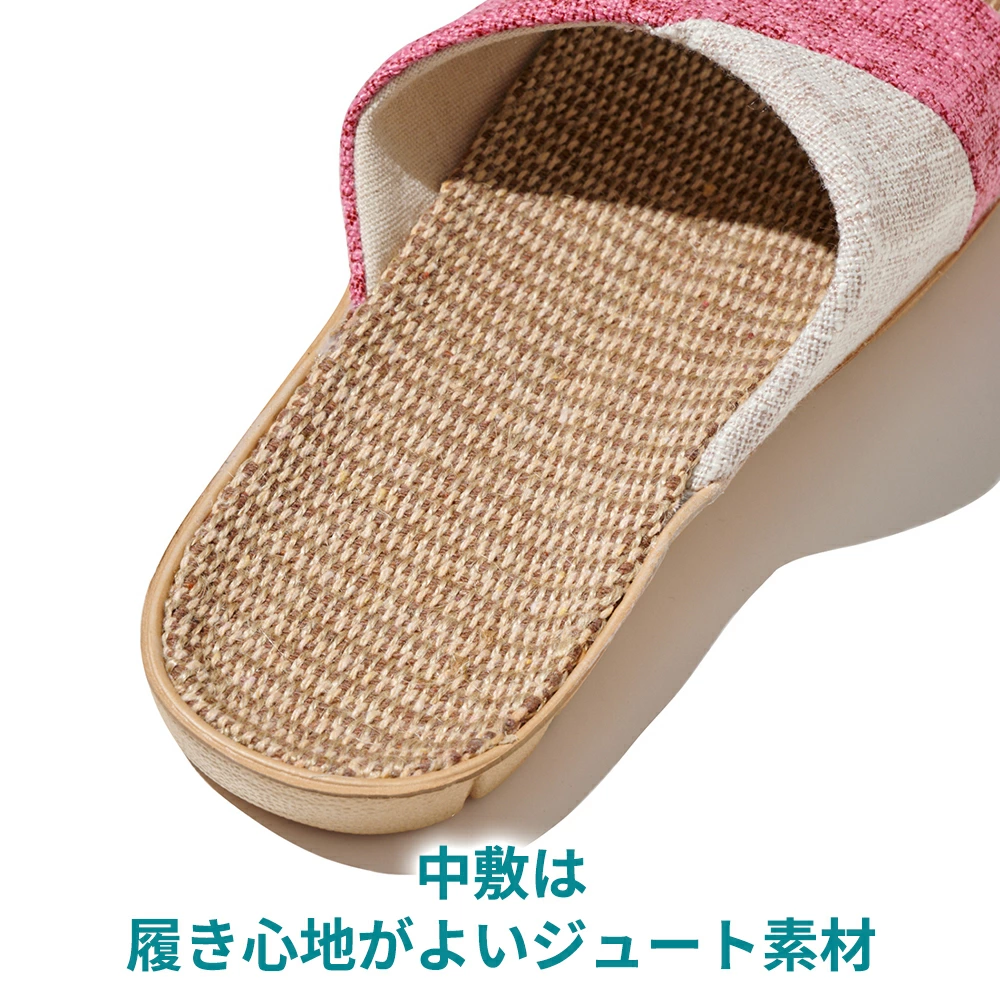 【商品名(JAN)】涼感切替デザインスリッパ グリーンM BCAM23000(4969354027674)涼感切替デザインスリッパ レッドM BCAM23000(4969354027681)涼感切替デザインスリッパ グリーンL BCAM24003(4969354028091)涼感切替デザインスリッパ レッドL BCAM24003(4969354028107)【適応サイズ(約)】M:約22.5~24cmL:約24.5~26cmヒール高:2cm【重さ(片足)】M:75gL:90g【材質】甲:ポリエステル中板:植物繊維(ジュート)・ポリエステル綿・その他底:EVA樹脂【製造国】中国【商品情報】インソールが指先・かかと・土踏まずと足形にそって形成されており、中敷はジュート素材なので履き心地がよいです。また素足で履いても蒸れにくく暑い季節も快適に過ごせます。洗えません。カラー:グリーン・レッド